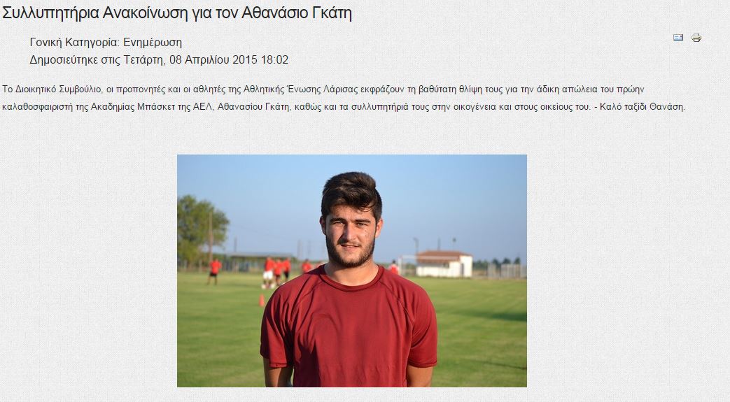 «Το Διοικητικό Συμβούλιο, οι προπονητές και οι αθλητές της Αθλητικής Ένωσης Λάρισας εκφράζουν τη βαθύτατη θλίψη τους για την άδικη απώλεια του πρώην καλαθοσφαιριστή της Ακαδημίας Μπάσκετ της ΑΕΛ, Αθανασίου Γκάτη, καθώς και τα συλλυπητήριά τους στην οικογένεια και στους οικείους του. – Καλό ταξίδι Θανάση.