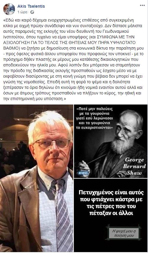 «Εδώ και καιρό δέχομαι ενορχηστρωμένες επιθέσεις από συγκεκριμένη κλίκα με αιχμή πρώην συνάδελφο και νυν συνταξιούχο. Δεν δίστασε μάλιστα αυτός παραμονές της εκλογής του νέου διευθυντή του Γεωδυναμικού Ινστιτούτου, όπου τυχαίνει να είμαι υποψήφιος (και ΣΥΜΦΩΝΑ ΜΕ ΤΗΝ ΑΞΙΟΛΟΓΗΣΗ ΓΙΑ ΤΟ ΤΕΛΟΣ ΤΗΣ ΘΗΤΕΙΑΣ ΜΟΥ ΠΗΡΑ ΥΨΗΛΟΤΑΤΟ ΒΑΘΜΟ) να ζητήσει με δημοσίευση στα κοινωνικά δίκτυα την παραίτηση μου – προς όφελος φυσικά άλλου υποψηφίου που προφανώς τον υποκινεί – με το πρόσχημα δήθεν πλαστής εκ μέρους μου κατάθεσης δικαιολογητικών που αποδεικνύουν την ηλικία μου», αναφέρει στην ανάρτησή του ο κ. Τσελέντης.