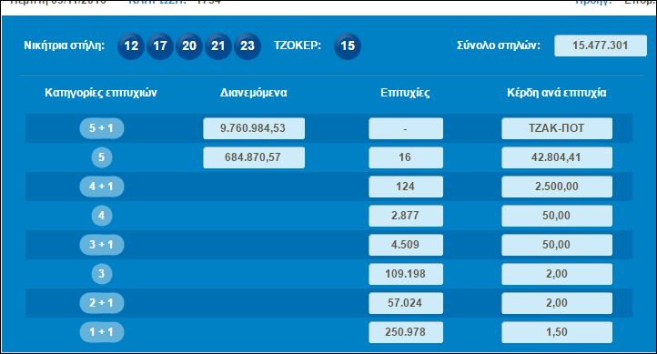 Νέο τζακ ποτ σημειώθηκε στην σημερινή κλήρωση του ΤΖΟΚΕΡ. Αυτό σημαίνει ότι στην κλήρωση της Κυριακής στην πρώτη κατηγορία θα μοιραστούν 11,5 εκατομμύρια ευρώ.
