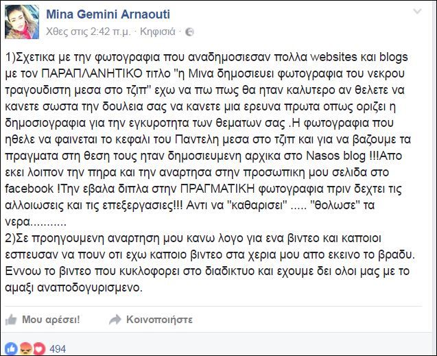 Η Μίνα Αρναούτη, μέσα από τον προσωπικό της λογαριασμό στο facebοok, κάνει σχεδόν καθημερινά αναρτήσεις σχετικά με τη μοιραία νύχτα του δυστυχήματος που κόστισε τη ζωή στον Παντελή Παντελίδη.