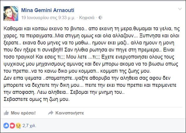 «Κάθομαι και κοιτάω εκείνο το βίντεο.. από εκείνη τη μέρα θυμάμαι τα γέλια, τις χαρές, τα πειράγματα..Μια στιγμή όμως και όλα αλλάζουν… Ξύπνησα και όλοι ξέρατε.. έκανα δυο μήνες να το μάθω.. ήμουν εκεί μαζί.. αλλά ήμουν η μόνη που δεν ήξερε τι συνέβη!!! Σαν ηλίθια ρώτησα αν πήγε στη πρεμιέρα.. Ειναι τόσο τραγικό! Και εσείς τι;;; Μου λετε …τι;;; Έχετε ενεργοποιήσει όλους τους ψυχικούς μου μηχανισμούς άμυνας και δεν μπορώ ακόμα να το βιώσω όπως του πρέπει..να το κάνω δικό μου κομμάτι.. κομμάτι της ζωής μου. Δεν είπα ψέματα ..σταματήστε.. ψάξτε αθόρυβα την αλήθεια σας αφού δεν μπορείτε να δεχτείτε την δική μου… πείτε την εκεί που πρέπει και περιμένετε την απόφαση. Λέω αλήθεια.. Σέβομαι την μνήμη του.. Σεβαστείτε όμως τη ζωή μου», έγραψε χαρακτηριστικά η κοπέλα.