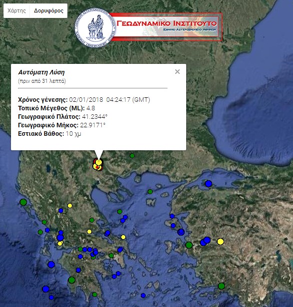 Συνεχίζεται η σεισμική ακολουθία στην Μακεδονία, όπου στις 6:22 σημειώθηκε νέα δόνηση μεγέθους 4,8 βαθμών της κλίμακας Ρίχτερ, βόρεια του Κιλκίς. Ο σεισμός είχε εστιακό βάθος 2 χλμ και έγινε ιδιαίτερα αισθητός στην περιοχή. Μερικά λεπτά αργότερα ακολούθησε κι άλλη σεισμική δόνηση στην ίδια περιοχή μεγέθους 3.5 Ρίχτερ. Σύμφωνα με την Πυροσβεστική Κιλκίς δεν έχουν αναφερθεί καταστροφές.