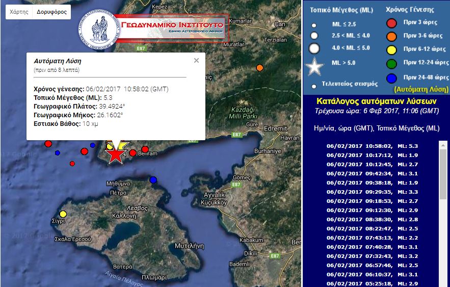 Σεισμική δόνηση μεγέθους 5,3 βαθμών της κλίμακας Ρίχτερ καταγράφηκε κοντά στη Μυτιλήνη στην Τουρκία.