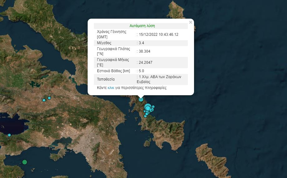 Νέος σεισμός 3,4 Ρίχτερ σημειώθηκε στις 12:43 στην Εύβοια. Σύμφωνα με το Γεωδυναμικό Ινστιτούτο, ο σεισμός είχε επίκεντρο 1 χλμ ανατολικά βορειοανατολικά των Ζαράκων, με εστιακό βάθος 5 χλμ. Και αυτή η σεισμική δόνηση έγινε αισθητή στην Αθήνα.