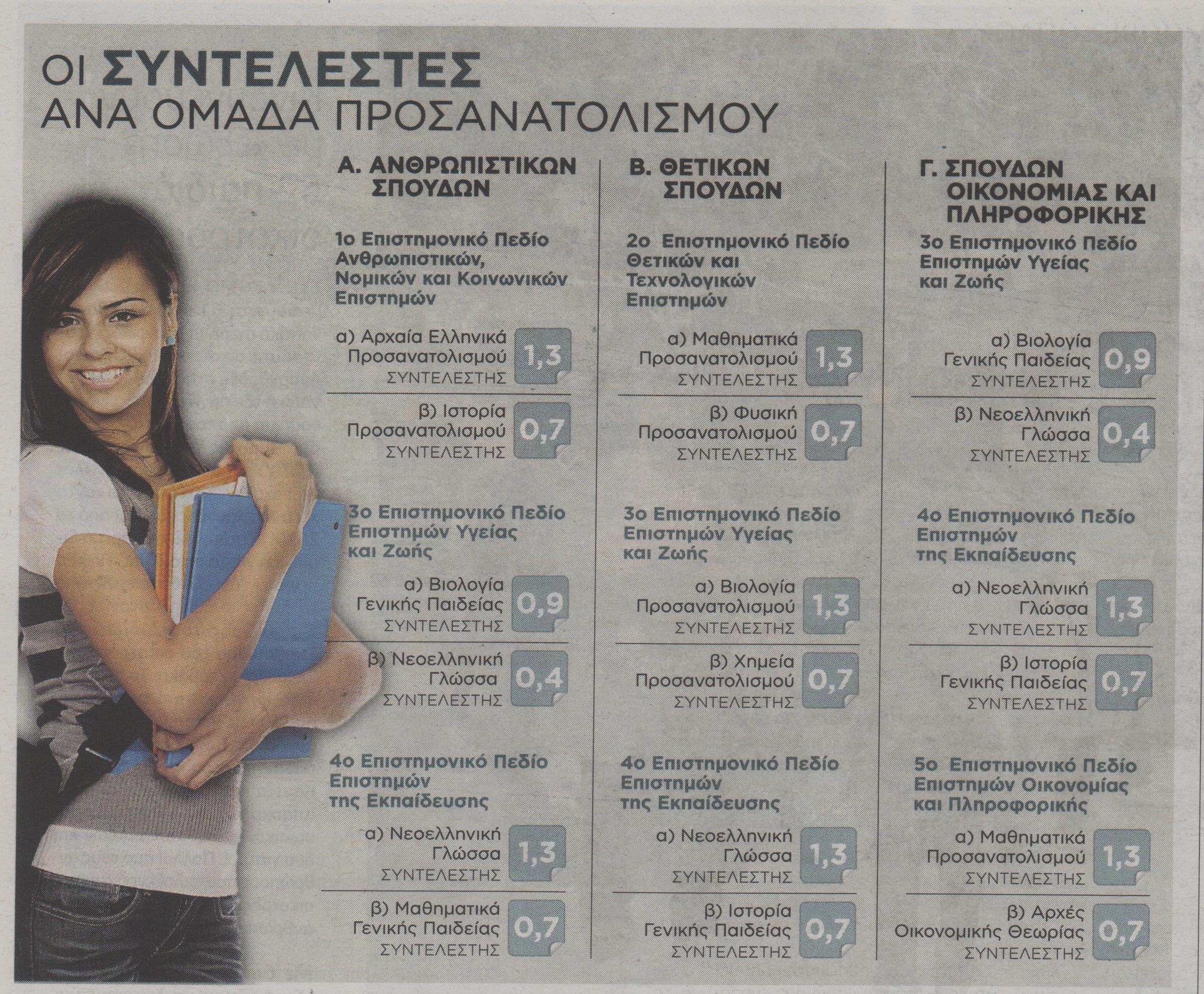 -Ο γραπτός βαθμός και των τεσσάρων μαθημάτων που θα επιλεγούν πολλαπλασιάζεται επί δύο. Παράδειγμα: Για έναν υποψήφιο στο 1ο Επιστημονικό Πεδίο (Ανθρωπιστικές Νομικές και Κοινωνικές Επιστήμες) θα προσμετράται το άθροισμα των μαθημάτων Αρχαία Ελληνικά, Ιστορία, Νεοελληνική Γλώσσα και Λατινικά επί 2 εφόσον επιθυμεί την εισαγωγή του σε σχολές του πρώτου πεδίου. Αν επιλέξει να ανοίξει και το 4ο επιστημονικό πεδίο (Επιστήμες της Εκπαίδευσης) θα εξεταστεί και στα Μαθηματικά και το γινόμενο για την εισαγωγή του στις σχολές αυτού του πεδίου θα αφορά τα εξής 4 μαθήματα: Αρχαία Ελληνικά, Νεοελληνική Γλώσσα, Ιστορία και Μαθηματικά).