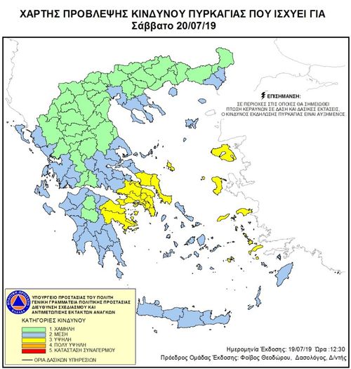 Σύμφωνα με το Χάρτη Πρόβλεψης Κινδύνου Πυρκαγιάς που εκδίδει η Γενική Γραμματεία Πολιτικής Προστασίας του Υπουργείου Εσωτερικών και Διοικητικής Ανασυγκρότησης, για σήμερα Σάββατο 20 Ιουλίου, προβλέπεται υψηλός κίνδυνος πυρκαγιάς (κατηγορία κινδύνου 3), σε ορισμένες περιοχές.