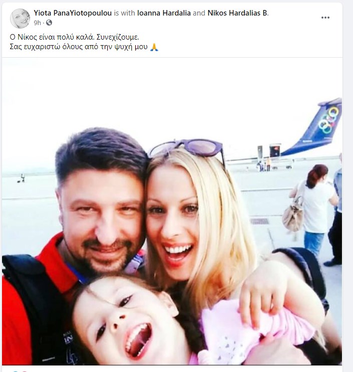 Η σύζυγος του Νίκου Χαρδαλιά, Γιώτα Παναγιωτοπούλου, στο πρώτο μήνυμά της στα social media μετά την περιπέτεια υγείας του υφυπουργού Πολιτικής Προστασίας, τονίζει ότι είναι καλά.