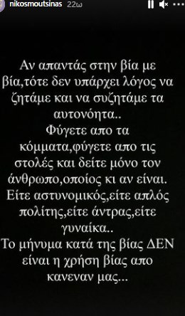 Με ανάρτησή του στο Instagram, ο Νίκος Μουτσινάς σχολίασε τα επεισόδια που σημειώθηκαν την Τρίτη στη Νέα Σμύρνη.