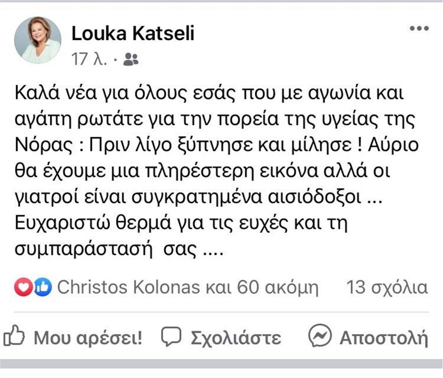 «Καλά νέα για όλους εσάς που με αγωνία και αγάπη ρωτάτε για την πορεία της υγείας της Νόρας : Πριν λίγο ξύπνησε και μίλησε ! Αύριο θα έχουμε μια πληρέστερη εικόνα αλλά οι γιατροί είναι συγκρατημένα αισιόδοξοι … Ευχαριστώ θερμά για τις ευχές και τη συμπαράστασή σας ….» αναφέρει η Λούκα Κατσέλη στο Facebook.