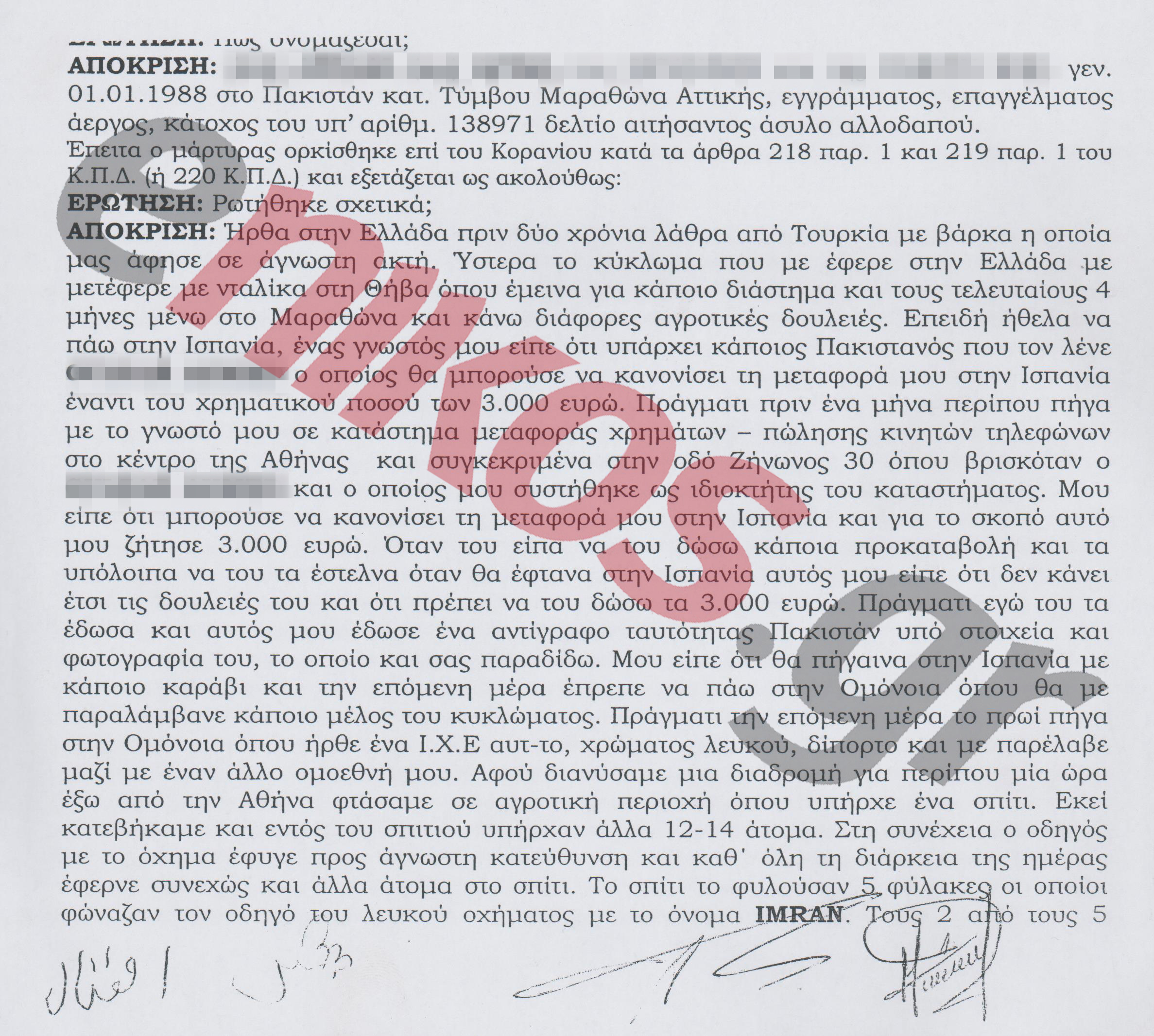 Όπως ανέφερε στην κατάθεσή του στους αστυνομικούς, του τμήματος συντονισμού της διεύθυνσης αλλοδαπών, στις 13 Φεβρουαρίου, που δημοσιεύει σήμερα ο enikos.gr, έδωσε 3.000 ευρώ σε έναν ομοεθνή του με σκοπό να κανονίσει τη μεταφορά του με πλοίο στην Ισπανία. Τον συνάντησε σε ένα κατάστημα μεταφοράς χρημάτων-πώλησης κινητών τηλεφώνων στην οδό Ζήνωνος στο κέντρο της Αθήνας, του οποίου όπως υποστήριξε ήταν ιδιοκτήτης.