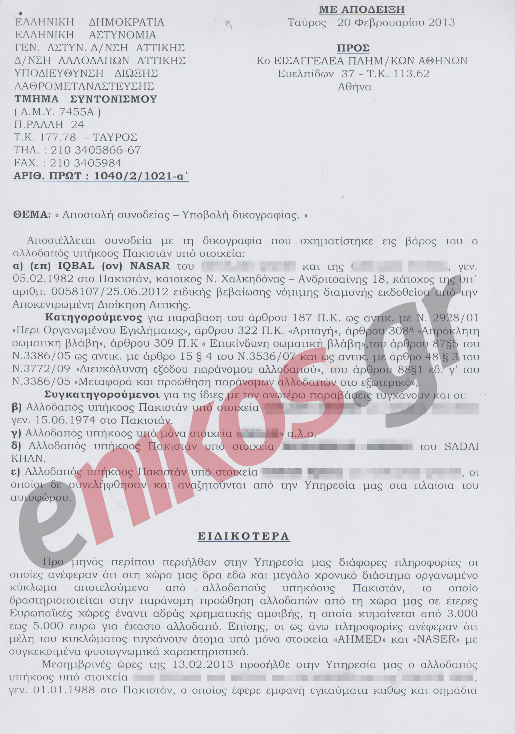 Η μαρτυρία του άτυχου νεαρού «έδεσε» με τις πληροφορίες που είχαν φτάσει εδώ και αρκετές εβδομάδες στο Τμήμα Συντονισμού της Διεύθυνσης Αλλοδαπών Αττικής ότι στη χώρα μας δρα εδώ και πολύ καιρό οργανωμένο κύκλωμα Πακιστανών, με στόχο την διακίνηση παράνομων μεταναστών σε χώρες της Ε.Ε. έναντι αδράς αμοιβής.