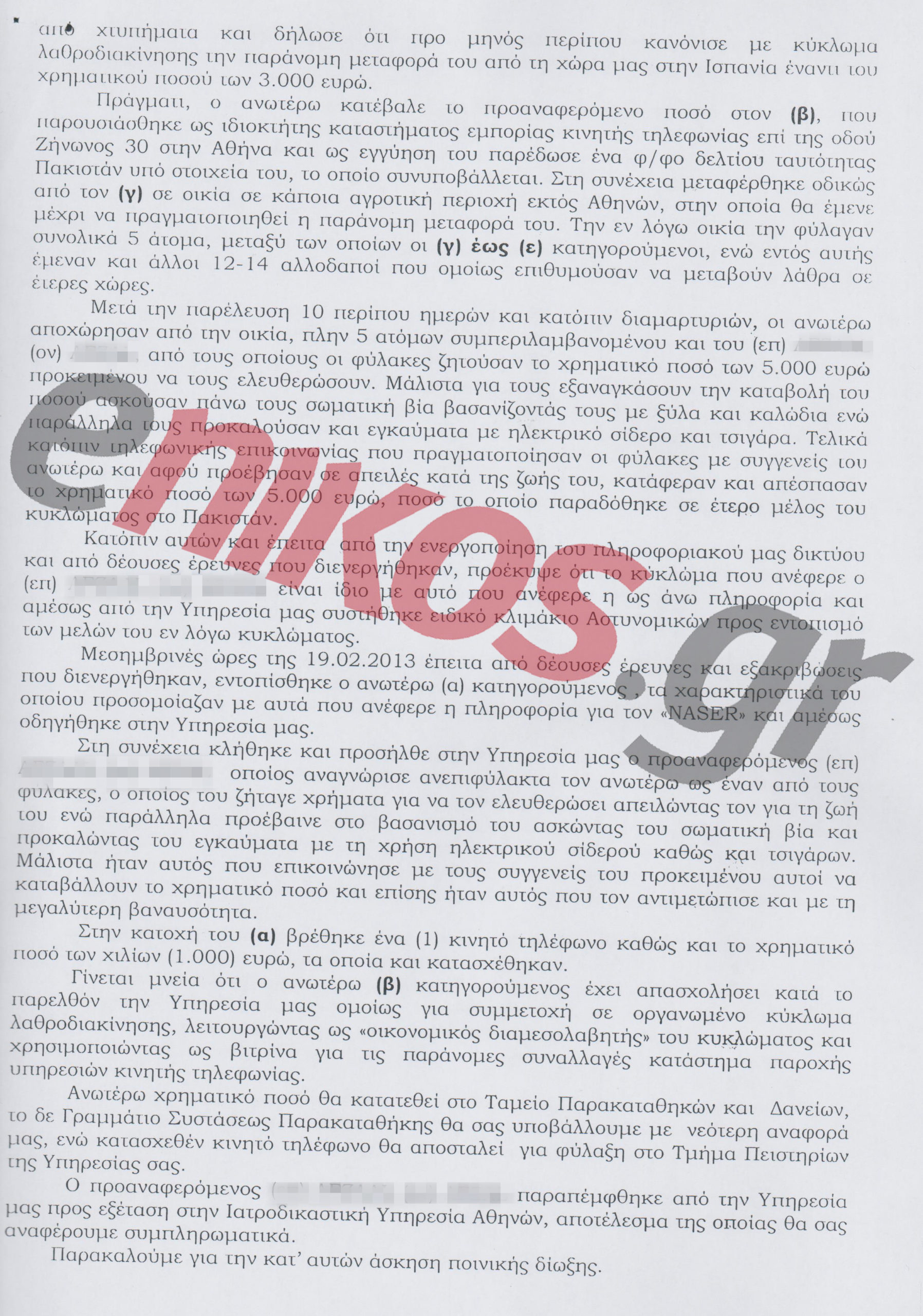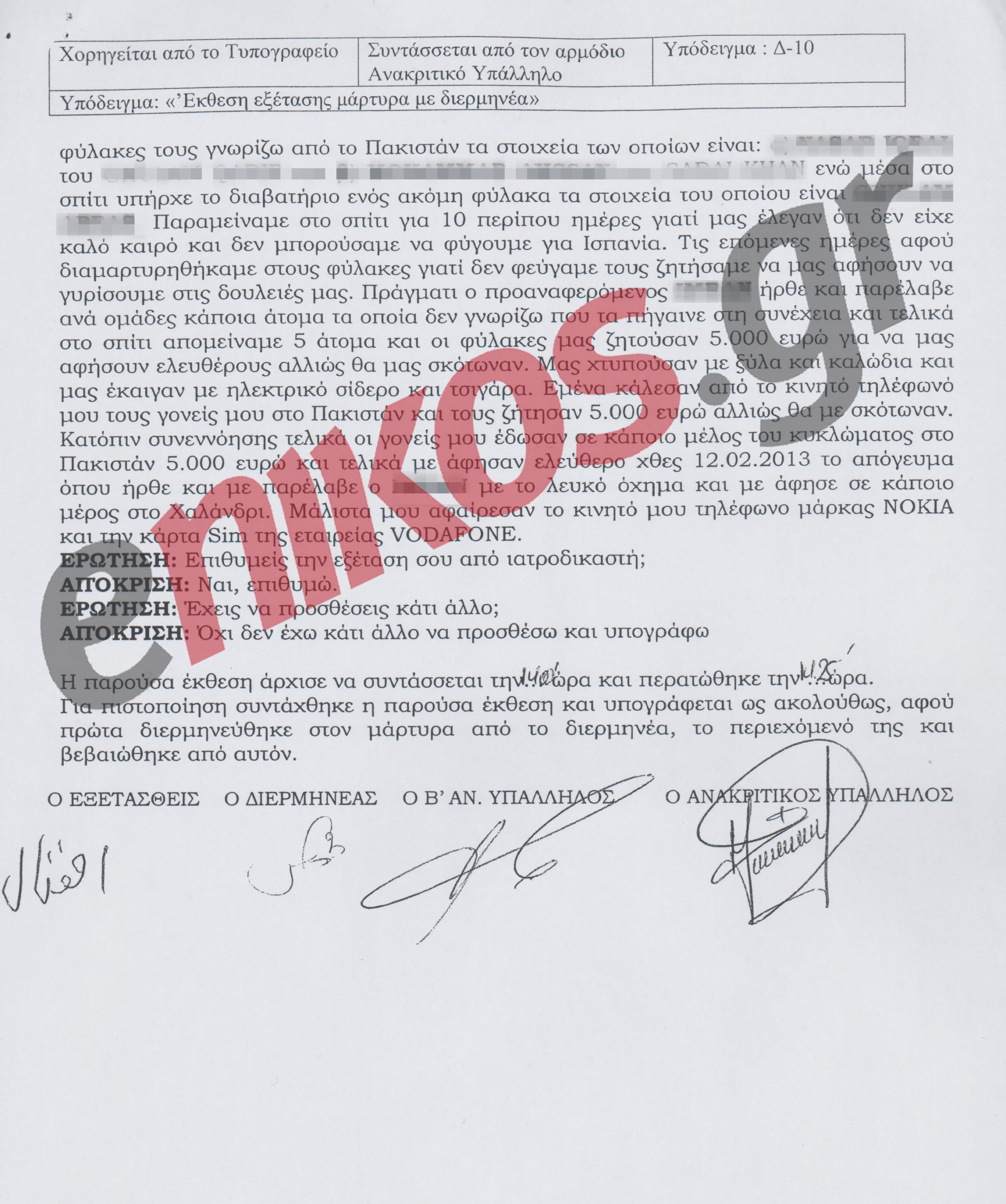 «Κάλεσαν από το κινητό μου τηλέφωνο τους γονείς μου στο Πακιστάν και ζήτησαν 5000 ευρώ, αλλιώς θα με σκότωναν. Τελικά οι γονείς μου έδωσαν σε κάποιο μέλος του κυκλώματος στο Πακιστάν τα χρήματα και με άφησαν ελεύθερο» σε κάποιο μέρος στο Χαλάνδρι, κατέληξε στην κατάθεσή του ο 24χρονος.
