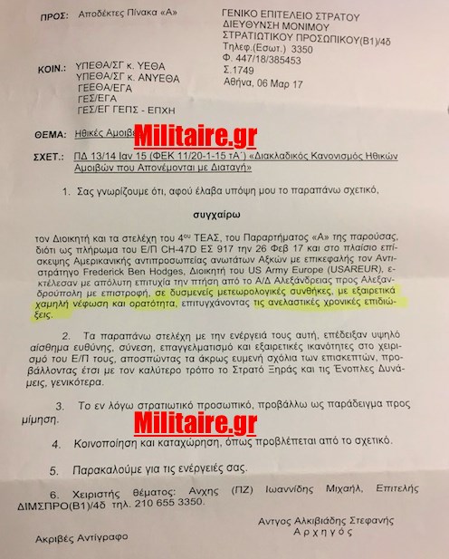Για να επιστρέψει από την Αλεξανδρούπολη στην Αλεξάνδρεια Ημαθίας ομάδα Ανώτατων Αμερικανών Αξιωματικών με επικεφαλής τον Αντιστράτηγο Φρέντερικ Χότζες διοικητή των αμερικανικών χερσαίων δυνάμεων στην Ευρώπη! Στο Σινούκ επέβαινε και ο Α/ΓΕΣ Αλκιβιάδης Στεφανής.