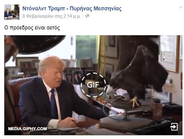 Το αποδεικνύει το Facebook, όπου έχει δημιουργηθεί μια σελίδα με το όνομα “Ντόναλντ Τραμπ – Πυρήνας Μεσσηνίας”. Στις πληροφορίες αναφέρεται ότι η σελίδα έχει δημιουργηθεί από φίλους και υποστηρικτές του Ντόναλντ Τραμπ στον νομό Μεσσηνίας, ωστόσο από μια γρήγορη ανάγνωση κανείς αντιλαμβάνεται πως πρόκειται για σελίδα “παρωδία”. Ο χρήστης του Facebook σατιρίζει τον δισεκατομμυριούχο, υποψήφιο για το προεδρικό χρίσμα των ρεπουμπλικανών και καυτηριάζει με χιούμορ τις απόψεις του.