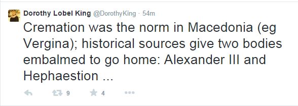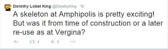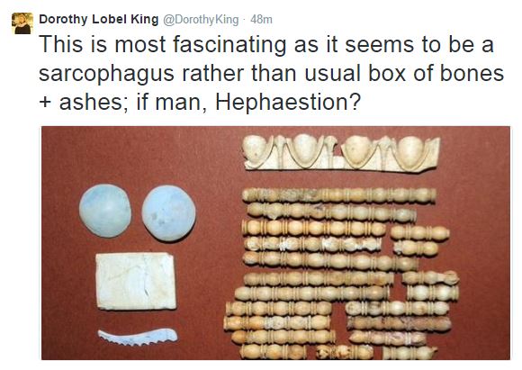 Η Αμερικανίδα αρχαιολόγος Ντόροθι Κινγκ εξέφρασε τις πρώτες σκέψεις της, σχετικά με τις νέες αποκαλύψεις στην Αμφίπολη, στον προσωπικό της λογαριασμό στο twitter.