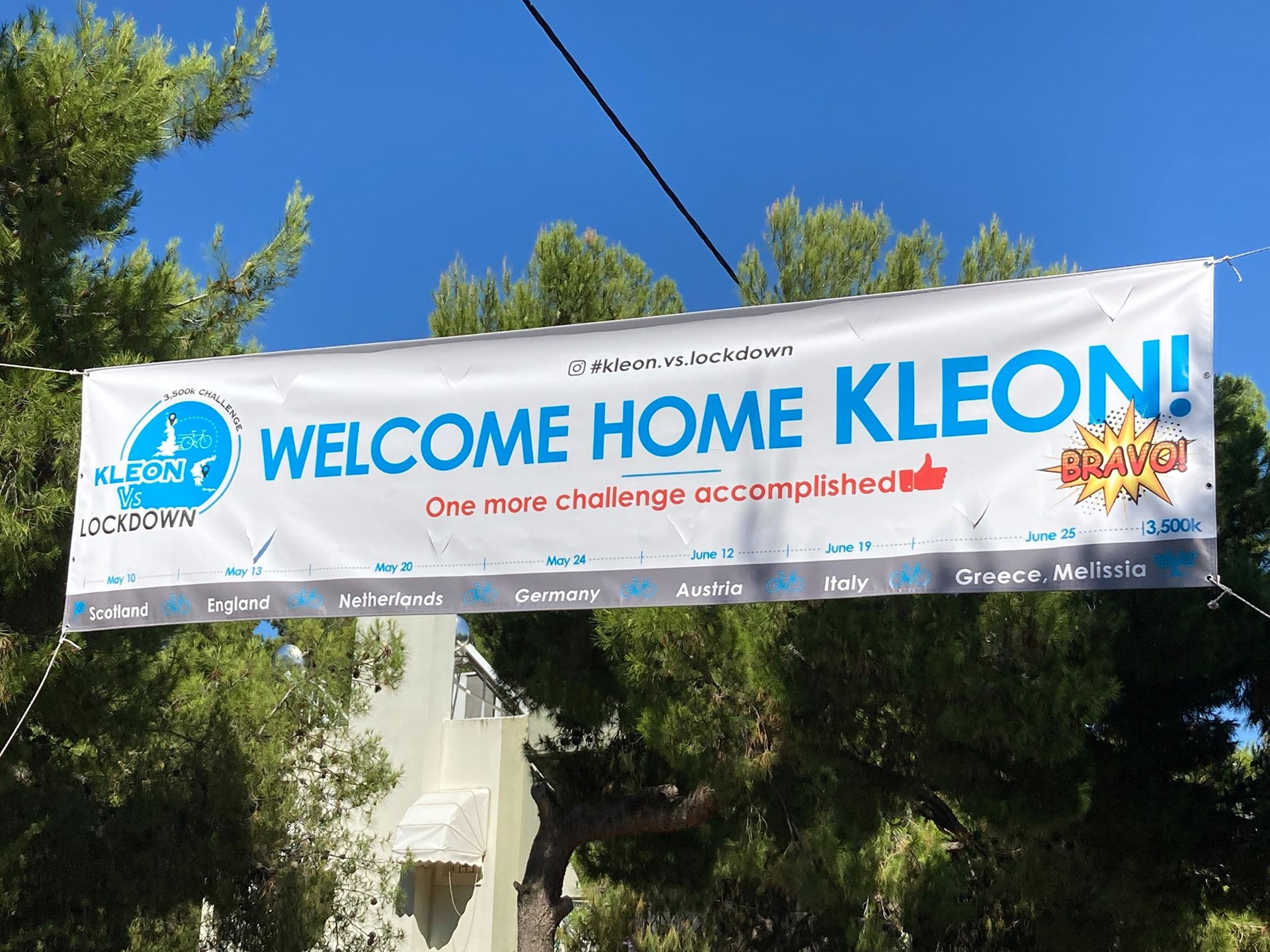Το ταξίδι του νεαρού σπουδαστή ξεκίνησε τελικά στις 10 Μαΐου 2020 και διασχίζοντας το Ηνωμένο Βασίλειο, την Ολλανδία, τη Γερμανία και την Αυστρία έφτασε στην Ιταλία, όπου από το λιμάνι της Αγκόνας πέρασε με πλοίο στην Πάτρα και από εκεί συνέχισε ώς την Αθήνα όπου η οικογένεια και φίλοι του τον υποδέχθηκαν στη γειτονιά του, τα Μελίσσια, με ένα μεγάλο πανό «Welcome Home Kleon- One more challenge accomplished»!