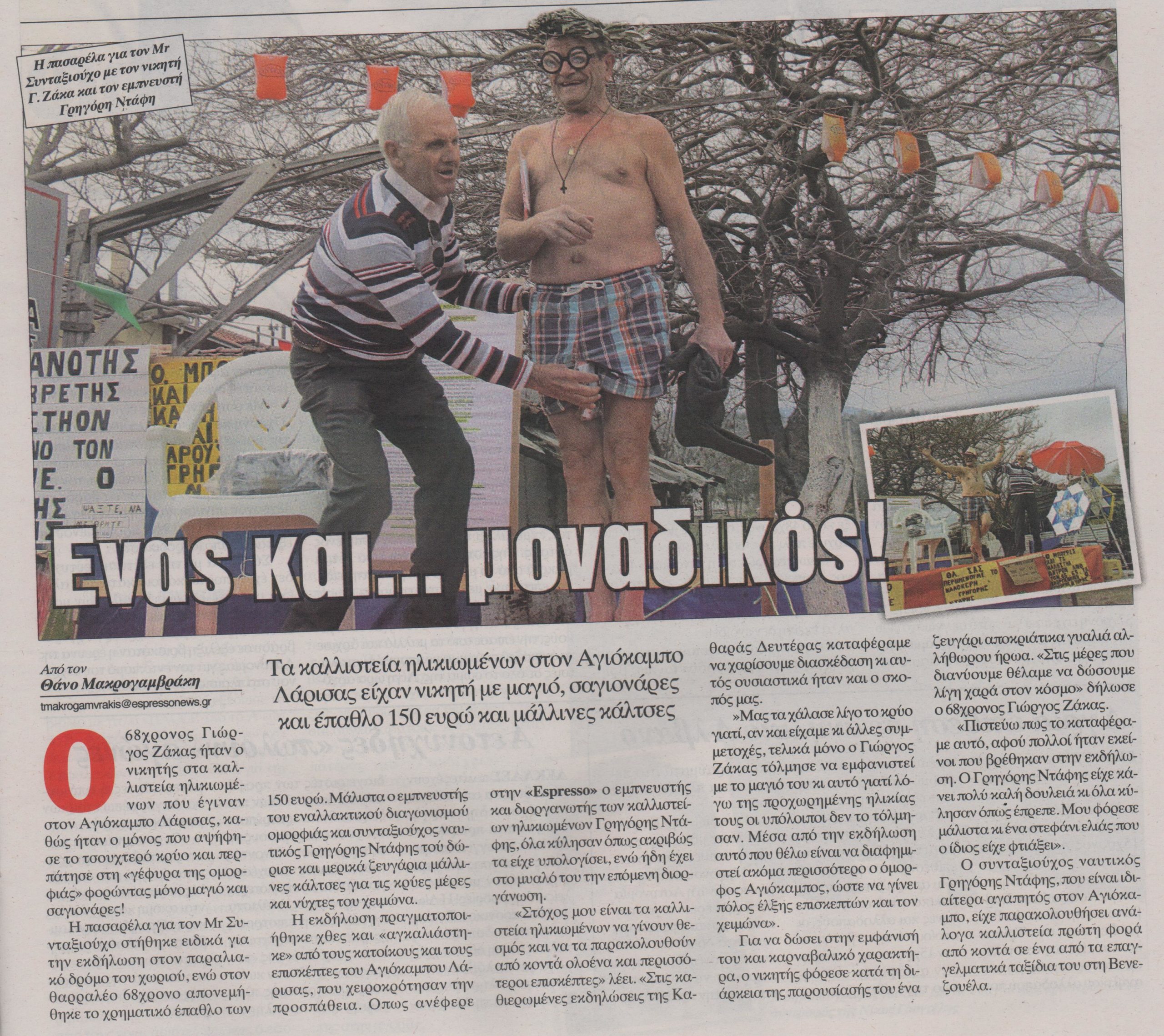 Ο 68χρονος Γιώργος Ζάκας ήταν ο νικητής στα καλλιστεία ηλικιωμένων που έγιναν στον Αγιόκαμπο Λάρισας, καθώς ήταν ο μόνος που αψήφησε το τσουχτερό κρύο και περπάτησε στη “γέφυρα της ομορφιάς” φορώντας μαγιό και σαγιονάρες!