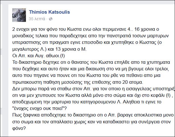 Την απόφαση του Μικτού Ορκωτού Δικαστηρίου στη Νεάπολη Λασιθίου για την υπόθεση του θανάτου του φιλάθλου του Εθνικού, Κώστα Κατσούλη στη Νέα Αλικαρνασσό, το Σεπτέμβριο του 2014, σχολίασε στην προσωπική του σελίδα στο Faceboook, ο αδελφός του Θύμιος.