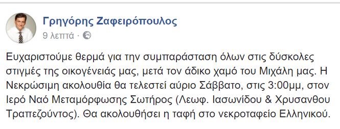 Με ανάρτησή του στο Facebook, ο Γρηγόρης Ζαφειρόπουλος ευχαρίστησε όλους για την συμπαράσταση τους στις δύσκολες στιγμές που περνάει η οικογένεια του, μετά την δολοφονία του αδελφού του Μιχάλη.