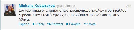 “Συγχαρητήρια στα τμήματα των Στρατιωτικών Σχολών που έψαλλαν λεβέντικα τον Εθνικό Υμνο χθες το βράδυ στην Ανάσταση στην Αθήνα”, έγραψε στο Twitter.
