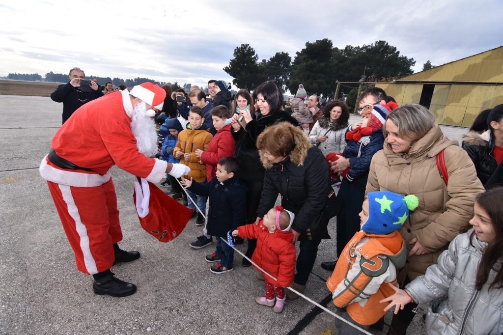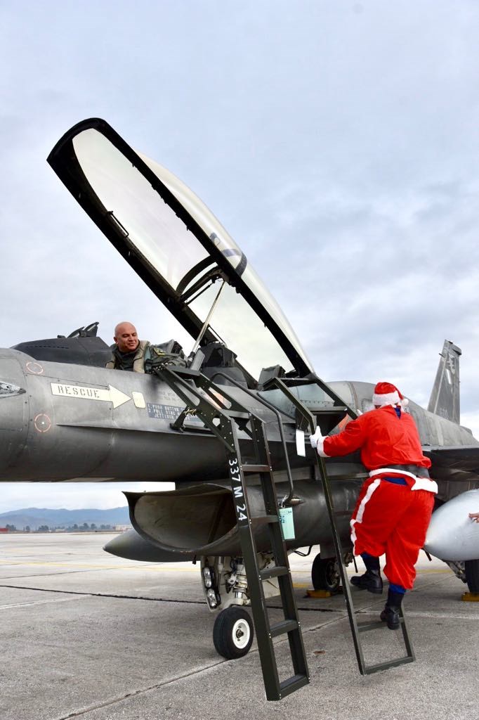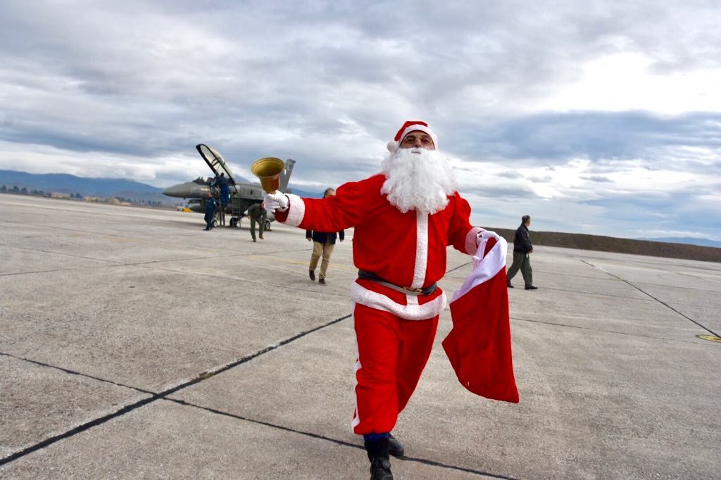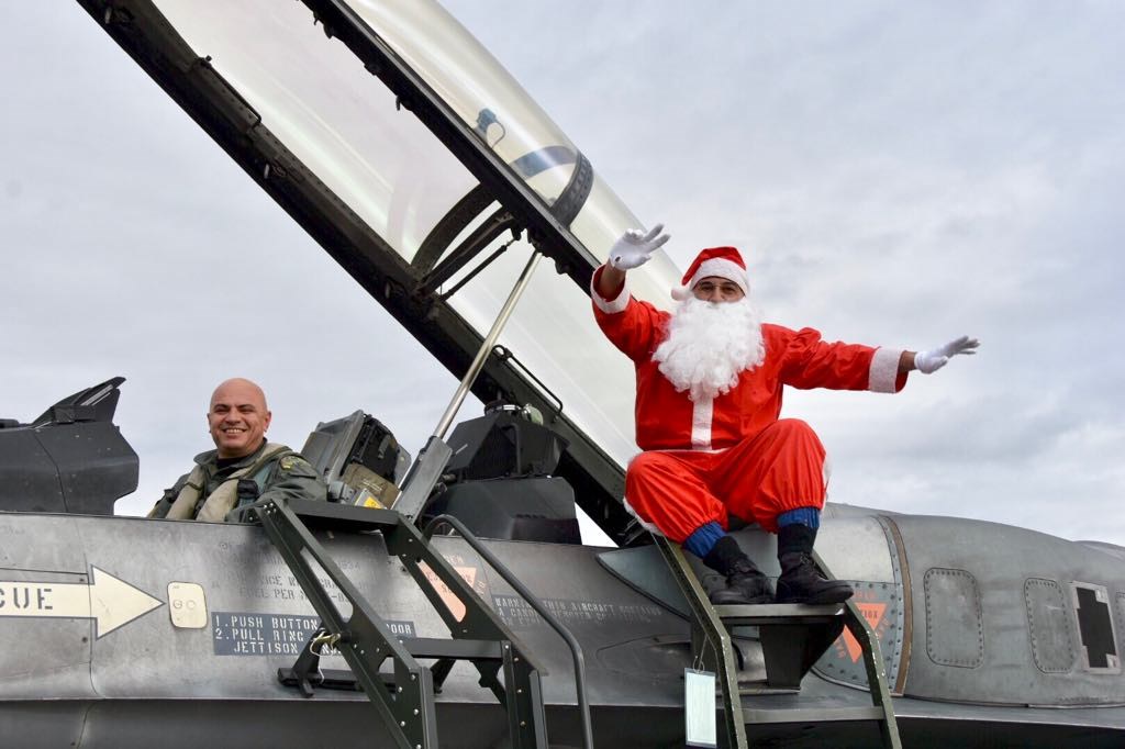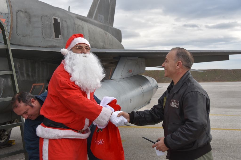 Προσγειώθηκε στην 110 Πτέρυγα Μάχης με ένα F-16 της Πολεμικής Αεροπορίας, όπου τα μικρά παιδιά τον περίμεναν με ανυπομονησία. Μοίρασε καραμέλες και δώρα στις οικογένειες των αεροπόρων. Πρόκειται για μια κοινή δράση της διοίκησης της 110 ΠΜ και της Αντιδημαρχίας Κοινωνικής Πολιτικής του Δήμου Λαρισαίων.