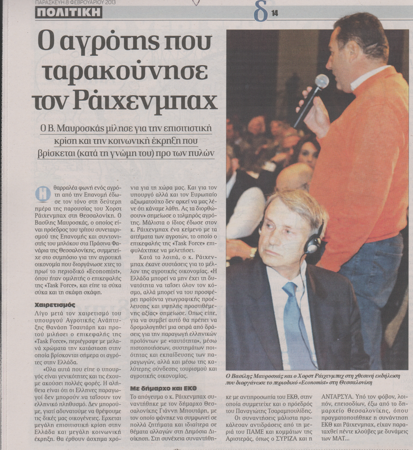 Η θαρραλέα φωνή ενός αγρότη από την Επανομή, όπως διαβάζουμε στο δημοσίευμα της εφημερίδας “Δημοκρατία”, έδωσε τον τόνο στη δεύτερη ημέρα της παρουσίας του Χορστ Ράιχενμπαχ στη Θεσσαλονίκη.
