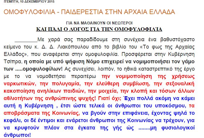 “Με χαρά σας παραδίδουμε στη συνέχεια ένα βαθυστόχαστο κείμενο του κ. Δ. Δ. Λιακόπουλου από το βιβλίο του «Το φως της Αρχαίας Ελλάδος», που αναφέρεται στην ομοφυλοφιλία. Προσφέρεται στην Κυβέρνηση Τσίπρα, η οποία με υπό ψήφιση Νόμο επιχειρεί να νομιμοποιήσει τον γάμο των …..ομοφυλοφίλων! Ας συνεχίσει, λοιπόν, το ηθικά καταστρεπτικό της έργο με το να νομοθετήσει περαιτέρω την νομιμοποίηση της χρήσεως ναρκωτικών, την πολυγαμία, την ελεύθερη συμβίωση, την σεξουαλική κακοποίηση ανηλίκων παιδιών, την μοιχεία, την κλοπή και τόσων άλλων αθλιοτήτων της ανθρώπινης ψυχής! Γιατί όχι; Έχει πολλά ακόμη να κάμει αυτή η Κυβέρνηση , έτσι ώστε τελικά οι άνθρωποι του υποκόσμου, τα αποβράσματα της Κοινωνίας, να βγούν στην επιφάνεια, έχοντας ψηλά το κεφάλι, οι δέ έντιμοι και ενάρετοι άνθρωποι της Κοινωνίας να τρέχουν, για να κρυφτούν πλέον στα έγκατα της γής ώς ……..μη φυσιολογικοί άνθρωποι!” γράφει ο Μητροπολίτης Αμβρόσιος.