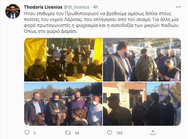 Όπως μεταδώσαμε νωρίτερα στο enikos.gr, ο Αρχηγός ΓΕΕΘΑ, Στρατηγός Κωνσταντίνος Φλώρος, μετά από επιθυμία του Πρωθυπουργού, μετέβη στις σεισμόπληκτες περιοχές της Θεσσαλίας. Εκεί, μαζί με τον υφυπουργό παρά τω Πρωθυπουργώ, Θοδωρή Λιβάνιο, βρέθηκαν δίπλα στους πολίτες του νομού Λάρισας για να διαπιστώσουν ιδίοις όμμασι τις ζημιές και τις ανάγκες των κατοίκων, όπως στο χωριό Δαμάσι, απ’ όπου και οι φωτογραφίες που ανήρτησε ο κος Λιβάνιος στον λογαριασμό του, στο Twitter.