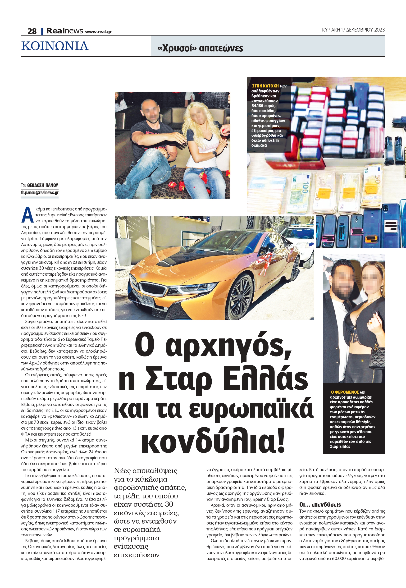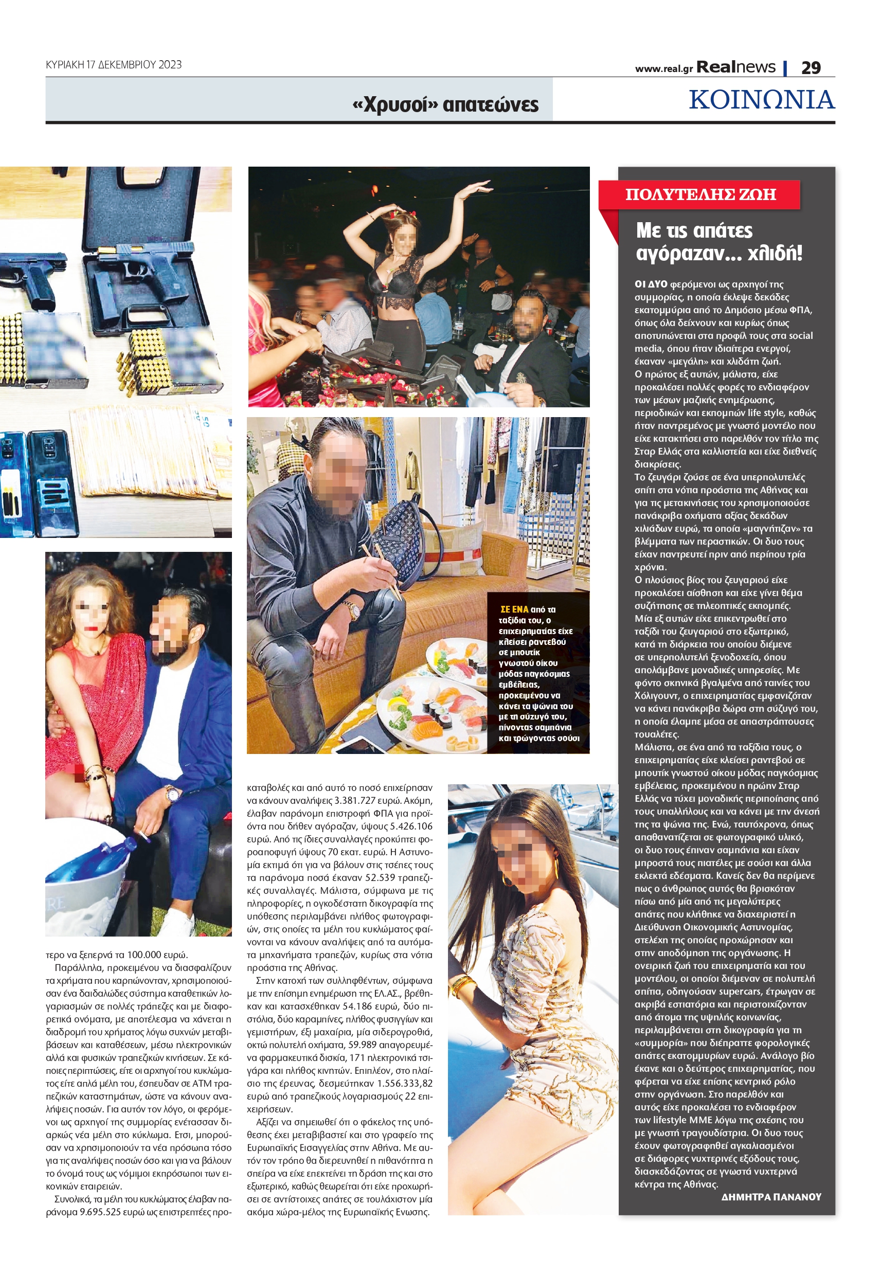 Μάλιστα, σε ένα από τα ταξίδια τους, ο επιχειρηματίας είχε κλείσει ραντεβού σε μπουτίκ γνωστού οίκου μόδας παγκόσμιας εμβέλειας, προκειμένου η πρώην Σταρ Ελλάς να τύχει μοναδικής περιποίησης από τους υπαλλήλους και να κάνει με την άνεσή της τα ψώνια της. Ενώ, ταυτόχρονα, όπως απαθανατίζεται σε φωτογραφικό υλικό, οι δυο τους έπιναν σαμπάνια και είχαν μπροστά τους πιατέλες με σούσι και άλλα εκλεκτά εδέσματα. Κανείς δεν θα περίμενε πως ο άνθρωπος αυτός θα βρισκόταν πίσω από μία από τις μεγαλύτερες απάτες που κλήθηκε να διαχειριστεί η Διεύθυνση Οικονομικής Αστυνομίας, στελέχη της οποίας προχώρησαν και στην αποδόμηση της οργάνωσης. Η ονειρική ζωή του επιχειρηματία και του μοντέλου, οι οποίοι διέμεναν σε πολυτελή σπίτια, οδηγούσαν supercars, έτρωγαν σε ακριβά εστιατόρια και περιστοιχίζονταν από άτομα της υψηλής κοινωνίας, περιλαμβάνεται στη δικογραφία για τη «συμμορία» που διέπραττε φορολογικές απάτες εκατομμυρίων ευρώ. Ανάλογο βίο έκανε και ο δεύτερος επιχειρηματίας, που φέρεται να είχε επίσης κεντρικό ρόλο στην οργάνωση. Στο παρελθόν και αυτός είχε προκαλέσει το ενδιαφέρον των lifestyle ΜΜΕ λόγω της σχέσης του με γνωστή τραγουδίστρια. Οι δυο τους έχουν φωτογραφηθεί αγκαλιασμένοι σε διάφορες νυχτερινές εξόδους τους, διασκεδάζοντας σε γνωστά νυχτερινά κέντρα της Αθήνας.