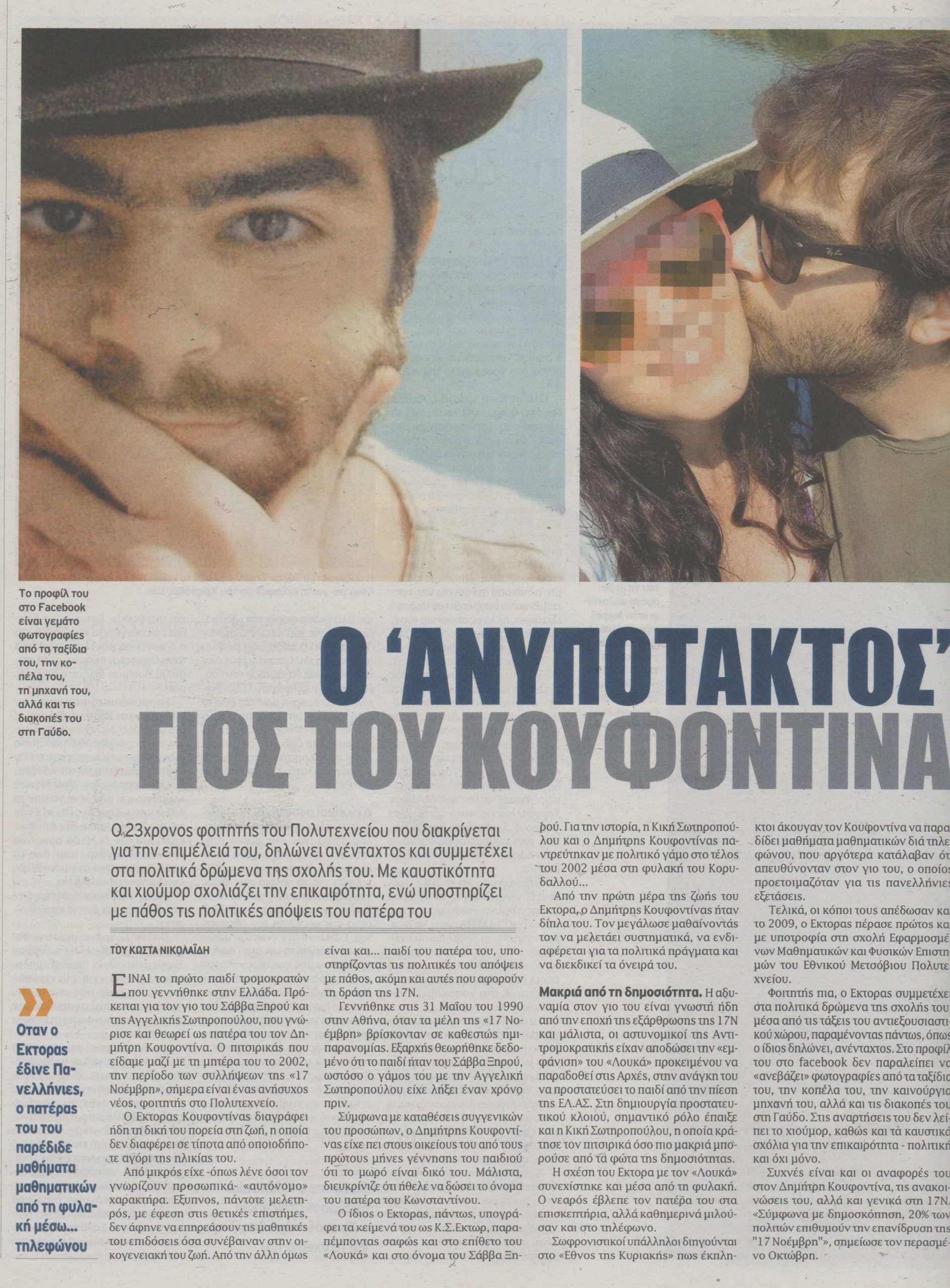 Ο πιτσιρικάς που είδαμε μαζί με τη μητέρα του το 2002, την περίοδο των συλλήψεων της «17 Νοέμβρη», σήμερα είναι ένας ανήσυχος νέος, φοιτητής στο Πολυτεχνείο. Ο Εκτορας Κουφοντίνας διαγράφει ήδη τη δική του πορεία στη ζωή, η οποία δεν διαφέρει σε τίποτα από οποιοδήποτε αγόρι της ηλικίας του.