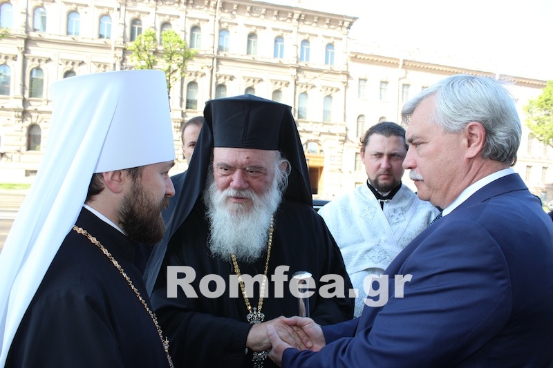 Στη συνέχεια υπογράμμισε: “Γι’ αυτό δέν απελπιζόμαστε και δεν απογοητευόμαστε. Πιστεύουμε, όπως πιστέψατε καί πιστεύετε καί εσείς, στο έλεος του Θεού καί αγωνιζόμαστε”. Της Θείας Λειτουργίας προεξήρχε ο Αρχιεπίσκοπος Αθηνών και πάσης Ελλάδος κ. Ιερώνυμος, συλλειτουργούντος του Σεβ. Μητροπολίτη Αγίας Πετρουπόλεως και Λάτογκα κ. Βλαδιμήρου.Νωρίτερα ο Αρχιεπίσκοπος έτυχε θερμής υποδοχής στην είσοδο του Ναού, από τον Κυβερνήτη της Αγίας Πετρούπολης κ. Γκεόργκι Πολτάφτσκενκο.Να σημειωθεί ότι σήμερα ο Σεβ. Μητροπολίτης Αγίας Πετρουπόλεως εορτάζει και τα 83α γενέθλια του, ενώ επίσης εορτάζει και η πόλη.