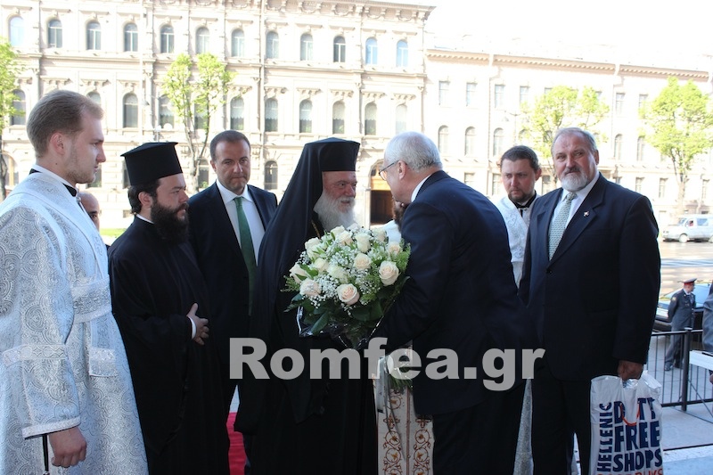 Στη συνέχεια υπογράμμισε: “Γι’ αυτό δέν απελπιζόμαστε και δεν απογοητευόμαστε. Πιστεύουμε, όπως πιστέψατε καί πιστεύετε καί εσείς, στο έλεος του Θεού καί αγωνιζόμαστε”. Της Θείας Λειτουργίας προεξήρχε ο Αρχιεπίσκοπος Αθηνών και πάσης Ελλάδος κ. Ιερώνυμος, συλλειτουργούντος του Σεβ. Μητροπολίτη Αγίας Πετρουπόλεως και Λάτογκα κ. Βλαδιμήρου.Νωρίτερα ο Αρχιεπίσκοπος έτυχε θερμής υποδοχής στην είσοδο του Ναού, από τον Κυβερνήτη της Αγίας Πετρούπολης κ. Γκεόργκι Πολτάφτσκενκο.Να σημειωθεί ότι σήμερα ο Σεβ. Μητροπολίτης Αγίας Πετρουπόλεως εορτάζει και τα 83α γενέθλια του, ενώ επίσης εορτάζει και η πόλη.