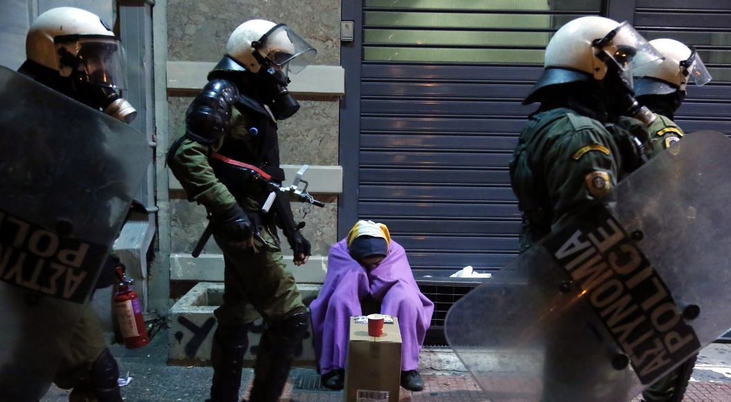 Έναν άστεγο ανάμεσα στους άνδρες των ΜΑΤ απαθανάτισε ο φωτογραφικός φακός, στην πορεία μνήμης για τον Αλέξανδρο Γρηγορόπουλο.