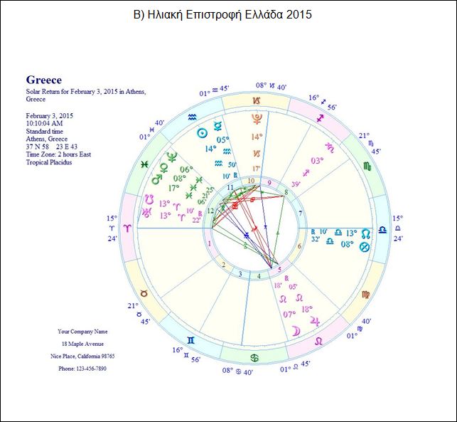– Eπόμενη Ηλιακή Επιστροφή σημείωση: Ωροσκόπος 22ο Καρκίνου σε τρίγωνο με γενέθλια Αφροδίτη = Μ/Δ Δία/Ουρανού και Ουρανού / Πλούτωνα natal. Σελήνη S.R. με κίνηση προς τα πίσω δείχνει ότι κατά τον Οκτώβριο έχει κλείσει τρίγωνο με MC S.R., ενώ το MC S.R. = Μ/Δ Δία/ Πλούτωνα natal και σχηματίζει σύνοδο με Πλούτωνα κι εξάγωνο Ουρανό natal Τα επόμενα γενέθλια της Ελλάδας (2016) βρίσκουν τη χώρα σε μια καλύτερη θέση ως προς τη σχέση με τους γείτονες, αλλά και ως προς την τύχη της αγοράς στο εσωτερικό. Πολλά δείχνουν να έχουν αλλάξει ριζικά, αλλά με τυχερό τρόπο που εμπνέει ελπίδα για μια πρώτη πορεία ουσιαστικής βελτίωσης. Τα οικονομικά της χώρας θα είναι σε πιο σταθερό μονοπάτι, ενώ πιθανότατα θα έχει αλλάξει ο τρόπος / το ύφος διακυβέρνησης, αλλά και η πηγή είτε ο τρόπος χρηματοδότησης και γενικότερης ροής του χρήματος. Μια τυχερή συμφωνία / εξέλιξη έχει φέρει σημαντικές αλλαγές ήδη από τον Οκτώβριο του 2015.