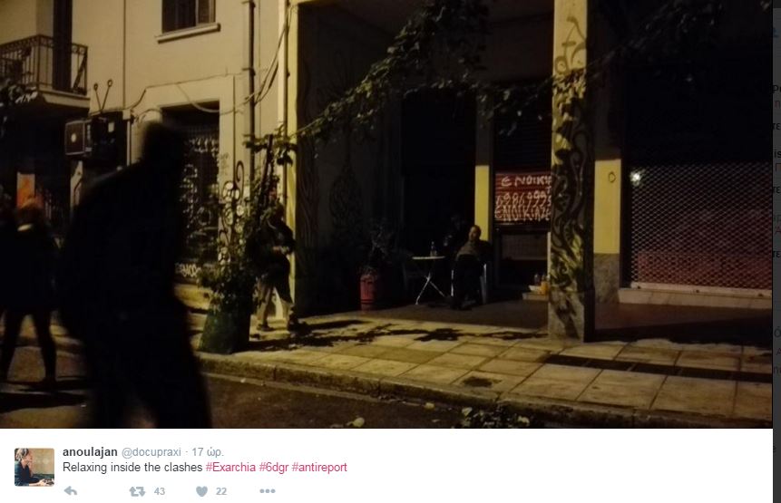 Τον γύρο του διαδικτύου κάνει μια φωτογραφία που τράβηξε Ισπανίδα δημοσιογράφος κατά τη διάρκεια των χθεσινών επεισοδίων στο κέντρο της Αθήνας. Ένας άντρας, αδιαφορώντας για τις μολότοφ και τα δακρυγόνα που έπεφταν δίπλα του, κάθισε σε ένα τραπεζάκι σε μαγαζί στα Εξάρχεια και ήπιε αμέριμνος την μπύρα του. Το στιγμιότυπο απαθανάτισε η Ισπανίδα δημοσιογράφος και ανέβασε τη φωτογραφία στο twitter γράφοντας: