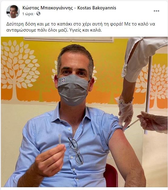 “Δεύτερη δόση και με το καπάκι στο χέρι αυτή τη φορά! Με το καλό να ανταμώσουμε πάλι όλοι μαζί. Υγιείς και καλά”, έγραψε ο κ. Μπακογιάννης.