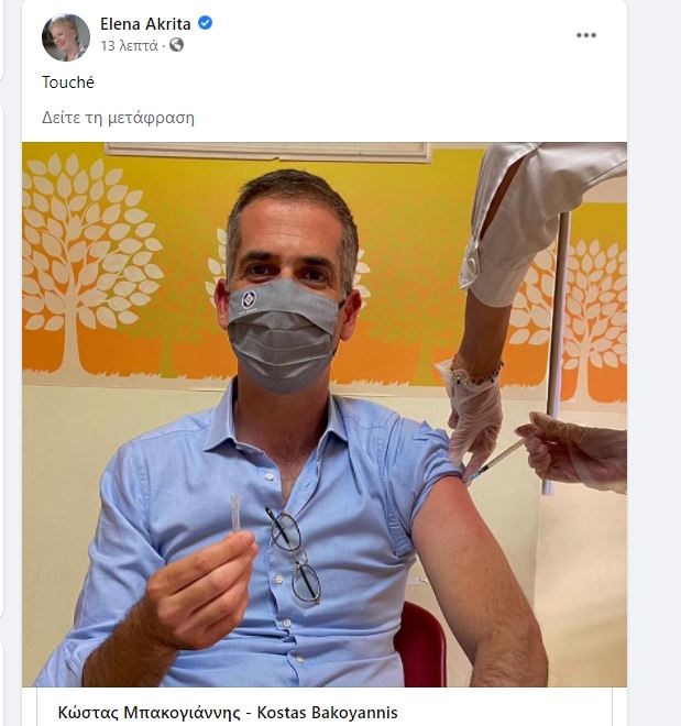 Στη συνέχεια, με νέα ανάρτησή της η Έλενα Ακρίτα είχε ζητήσει συγγνώμη από τον Κώστα Μπακογιάννη. “Δεν πόνεσε η ένεση, με εμβολίασαν με το καπάκι #not. Κύριε Κώστας Μπακογιάννης – Kostas Bakoyannis σάς οφείλω μια ειλικρινή συγγνώμη” είχε γράψει χαρακτηριστικά στον λογαριασμό της στο Facebook.