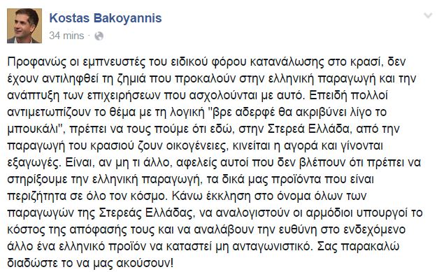 Ο περιφερειάρχης Στερεάς Ελλάδας, Κώστας Μπακογιάννης πήρε θέση για τον ειδικό φόρο κατανάλωσης στο κρασί, με ανάρτησή του στα κοινωνικά δίκτυα.
