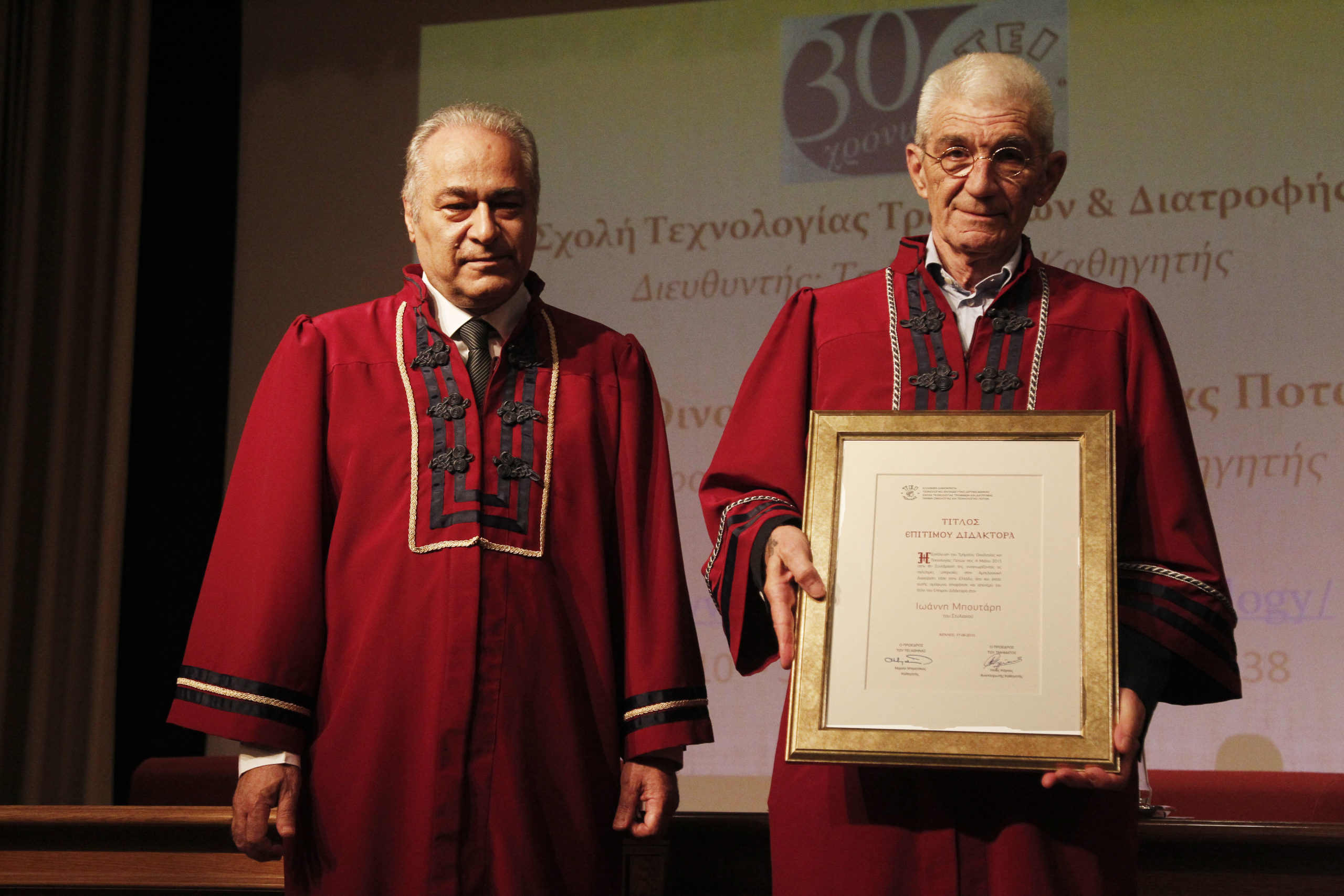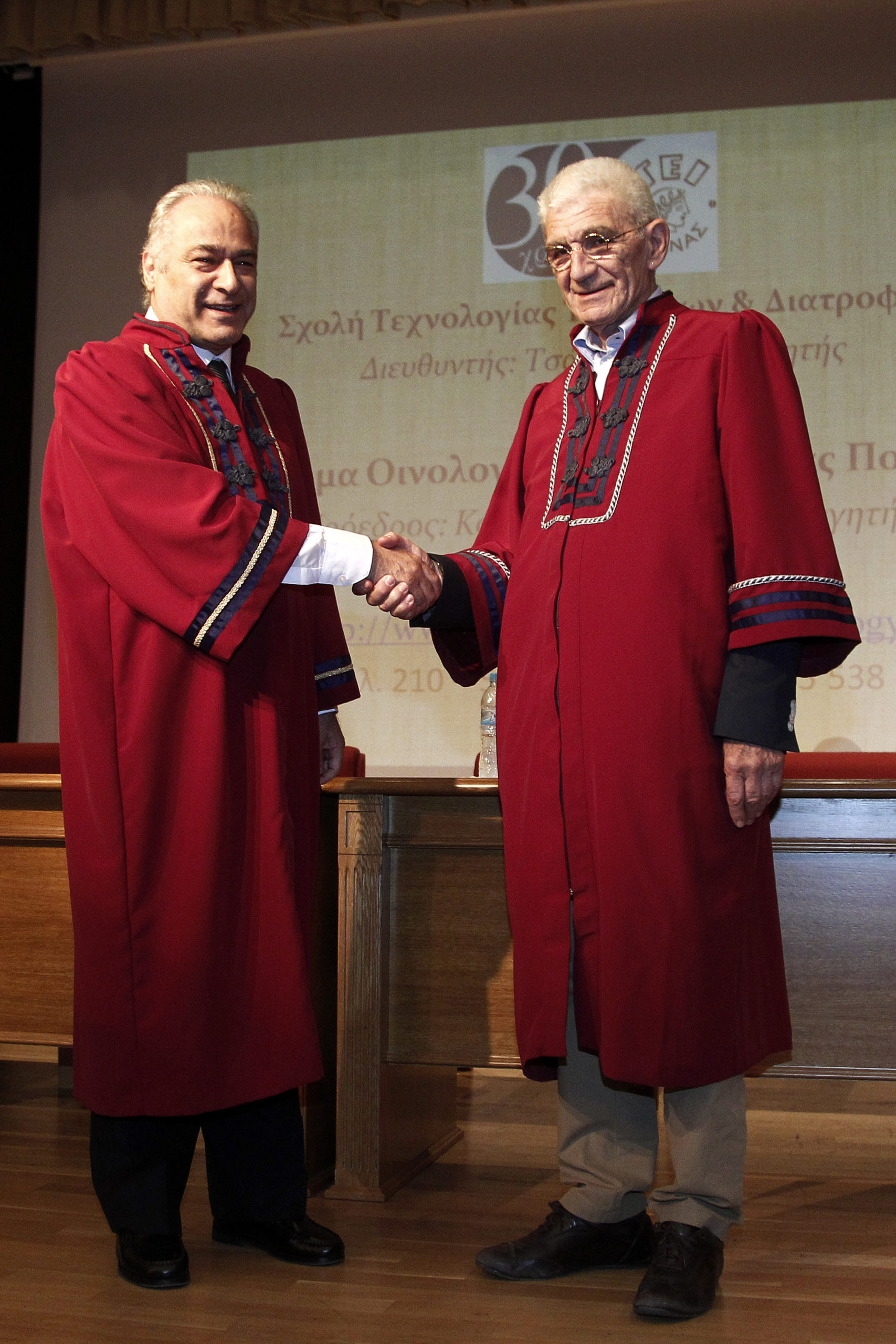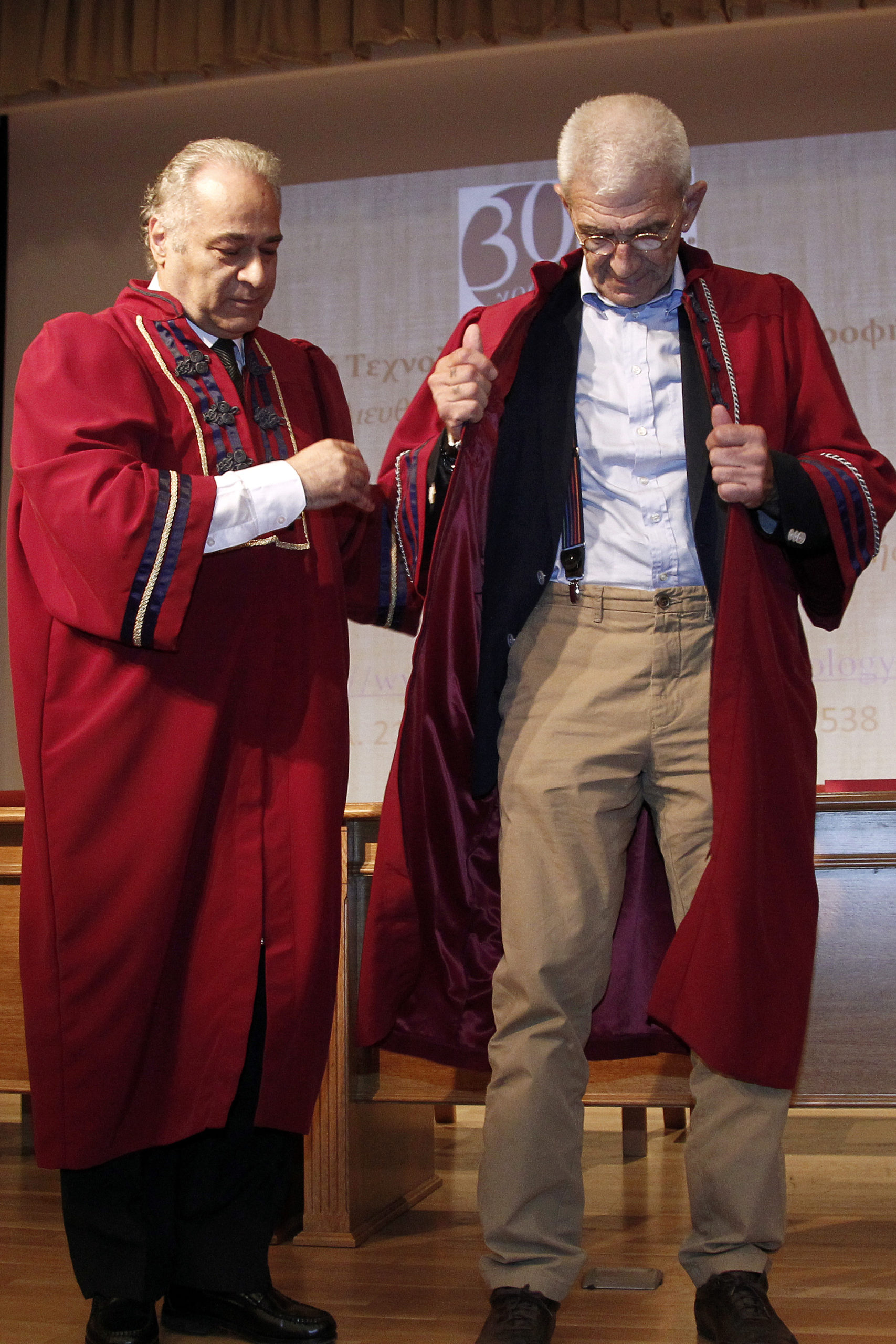 Ο δήμαρχος Θεσσαλονίκης, Γιάννης Μπουτάρης, φορώντας μία κόκκινη τήβεννο, αναγορεύεται σε επίτιμο διδάκτορα του Τμήματος Οινολογίας και Τεχνολογίας Ποτών από τον πρόεδρο του ΤΕΙ Αθήνας, Μιχαήλ Μπρατάκο, σε ειδική τελετή που πραγματοποιήθηκε σήμερα στο αμφιθέατρο του ΤΕΙ Αθήνας.