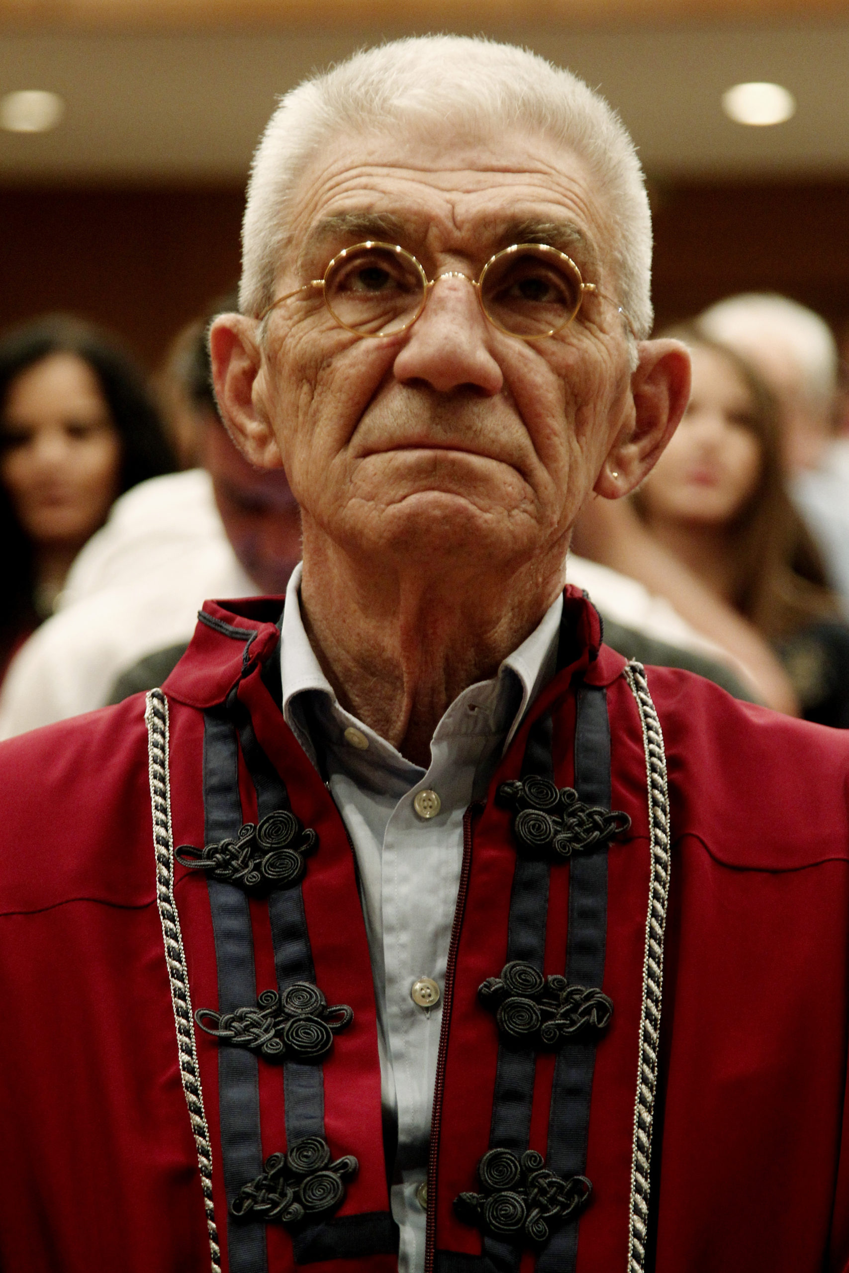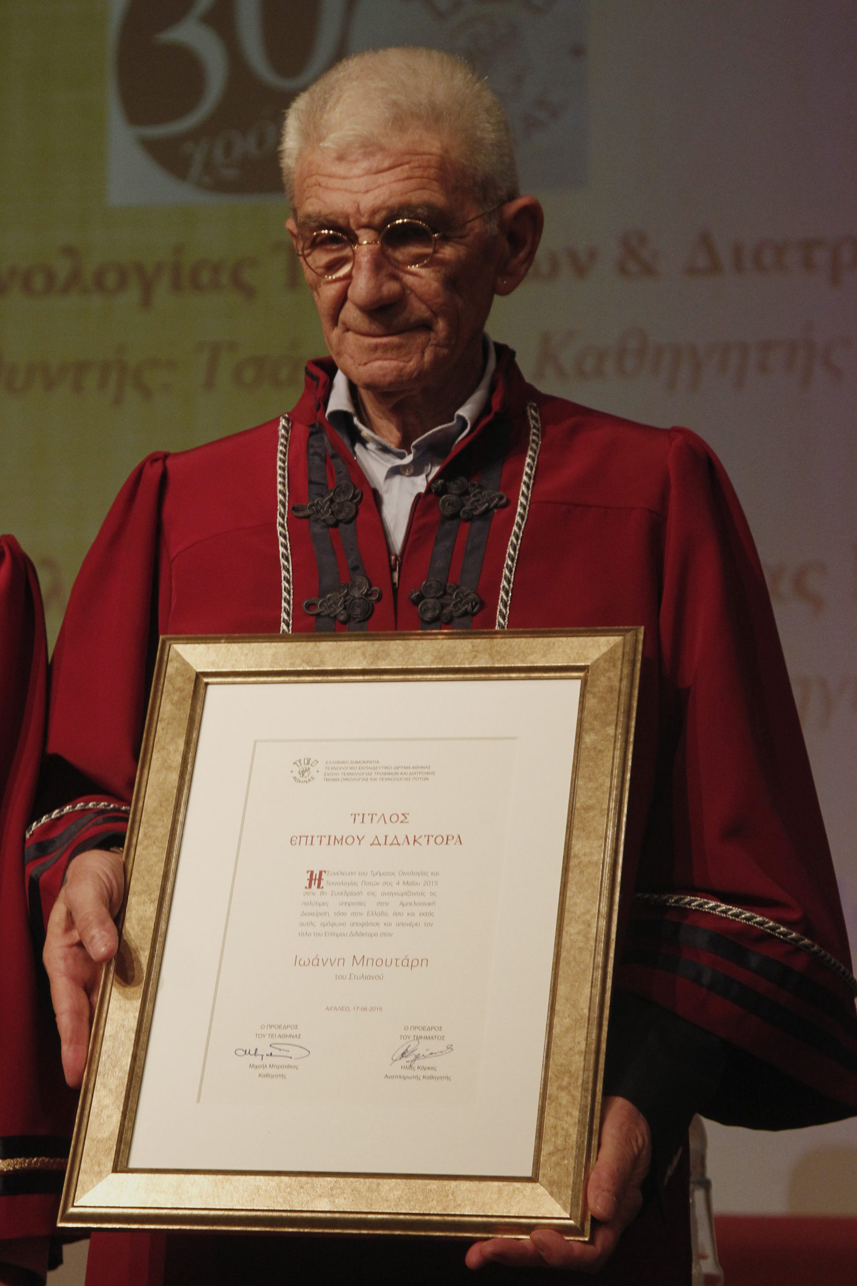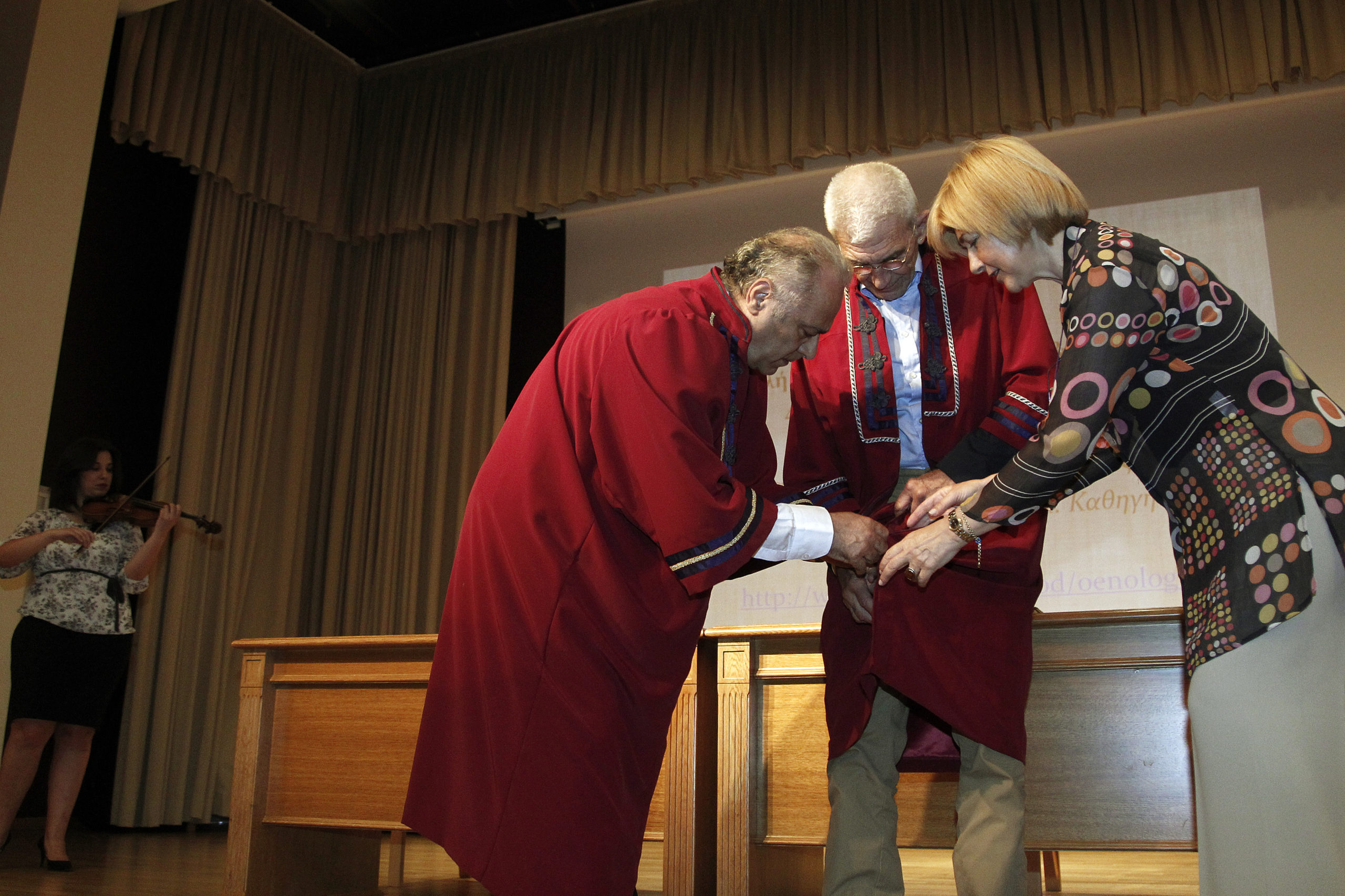 Ο δήμαρχος Θεσσαλονίκης, Γιάννης Μπουτάρης, φορώντας μία κόκκινη τήβεννο, αναγορεύεται σε επίτιμο διδάκτορα του Τμήματος Οινολογίας και Τεχνολογίας Ποτών από τον πρόεδρο του ΤΕΙ Αθήνας, Μιχαήλ Μπρατάκο, σε ειδική τελετή που πραγματοποιήθηκε σήμερα στο αμφιθέατρο του ΤΕΙ Αθήνας.