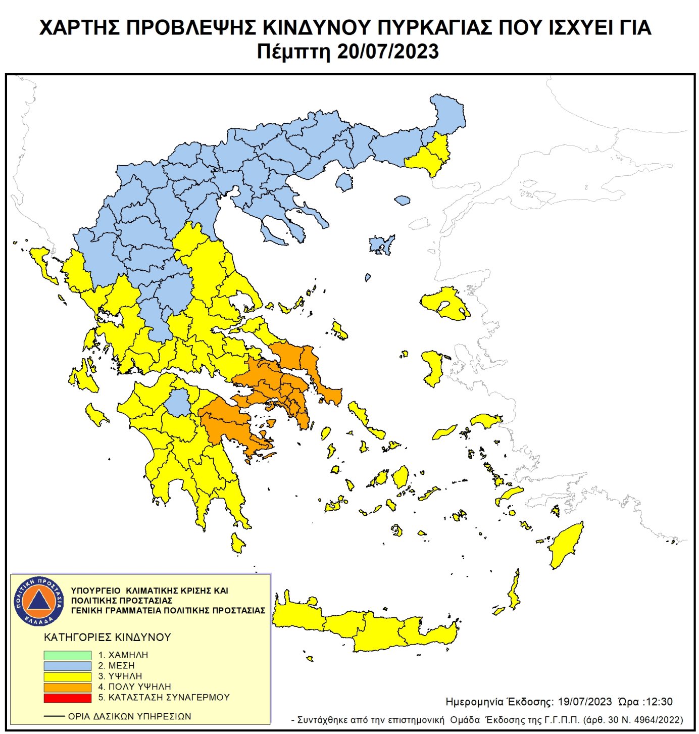 Σύμφωνα με τον Χάρτη Πρόβλεψης Κινδύνου Πυρκαγιάς που εκδίδει η Γενική Γραμματεία Πολιτικής Προστασίας του Υπουργείου Κλιματικής Κρίσης & Πολιτικής Προστασίας (civilprotection.gov.gr), για αύριο Πέμπτη 20 Ιουλίου 2023, προβλέπεται πολύ υψηλός κίνδυνος πυρκαγιάς (κατηγορία κινδύνου 4) για τις εξής περιοχές: