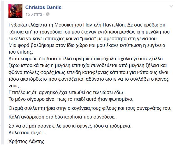 Ο Χρήστος Δάντης αποχαιρέτησε μέσω της προσωπικής του σελίδας στο Facebook, τον Παντελή Παντελίδη.