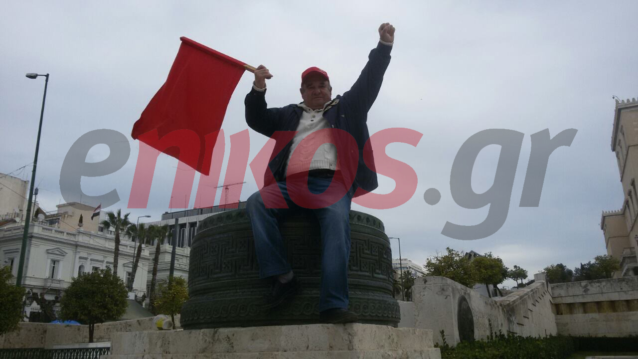 Από τους πολίτες που διαδηλώνουν εναντίον του ασφαλιστικού στο κέντρο της Αθήνας, την «παράσταση έκλεψε», ένας διαδηλωτής με την κόκκινη σημαία του, μπροστά στη Βουλή.