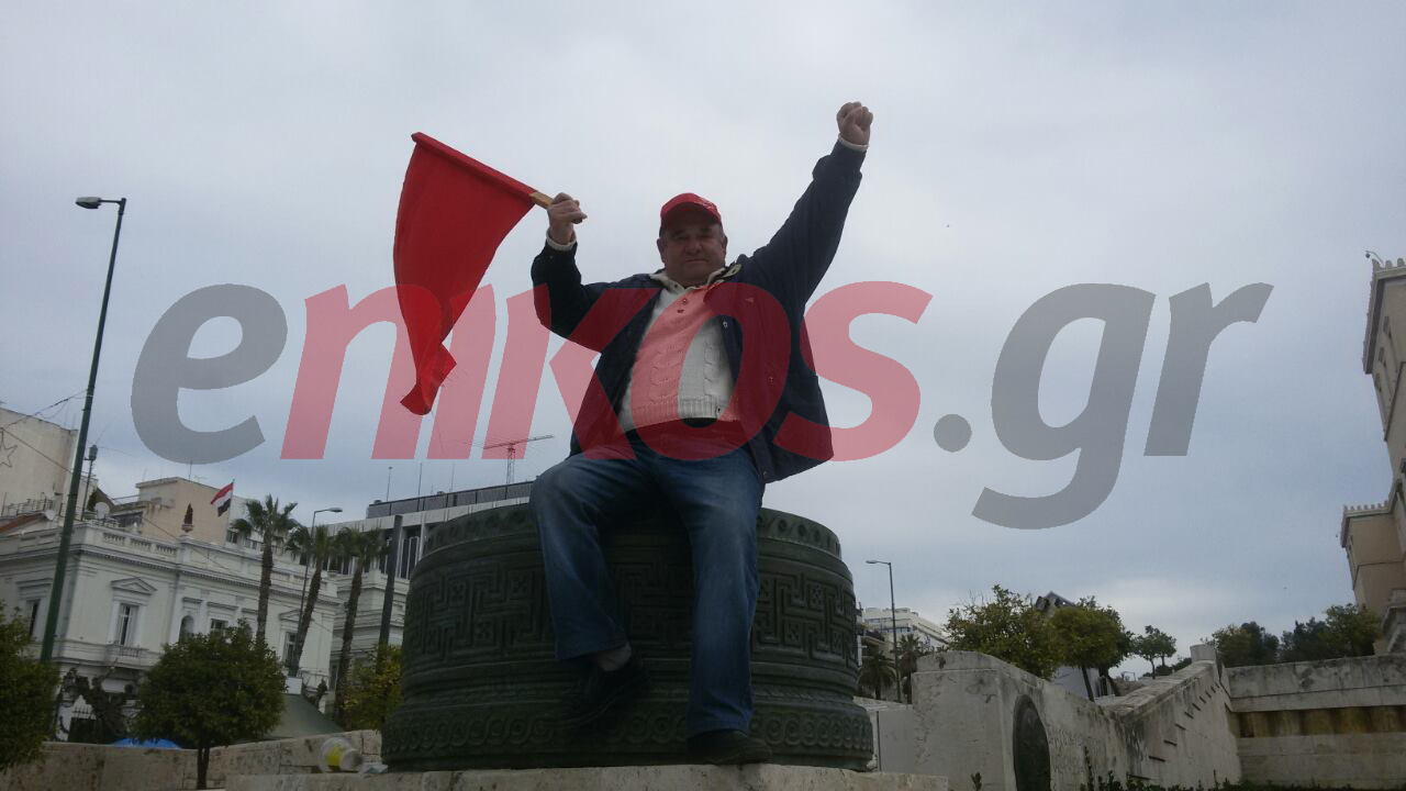 Από τους πολίτες που διαδηλώνουν εναντίον του ασφαλιστικού στο κέντρο της Αθήνας, την «παράσταση έκλεψε», ένας διαδηλωτής με την κόκκινη σημαία του, μπροστά στη Βουλή.