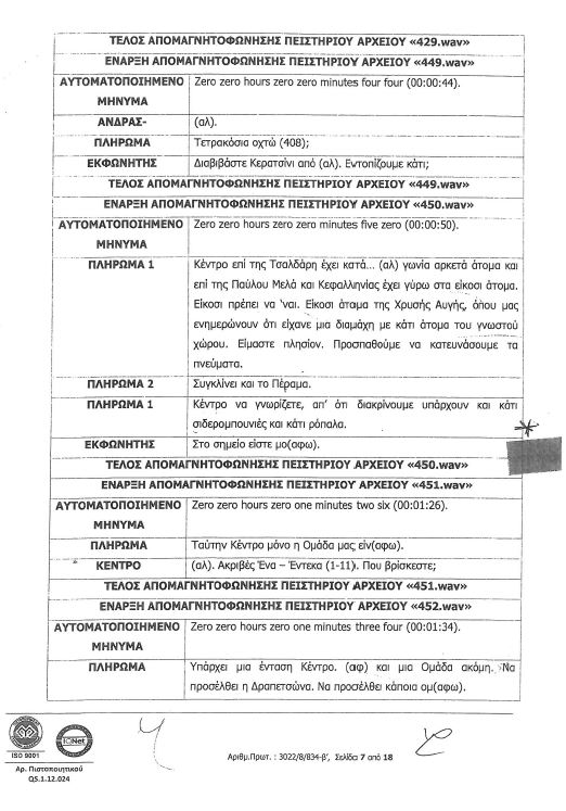 Σύμφωνα με πληροφορίες στο πόρισμα των Εγκληματολογικών Εργαστηριών που θα σταλεί στις δύο εφέτες ανακρίτριες που χειρίζονται την υπόθεση της Χρυσής Αυγής έχει γίνει απομαγνητοφώνηση της συνομιλίας που είχαν τα μέλη της ομάδας ΔΙΑΣ με το κέντρο Επιχειρήσεων της ΕΛΑΣ το μοιραίο βράδυ.