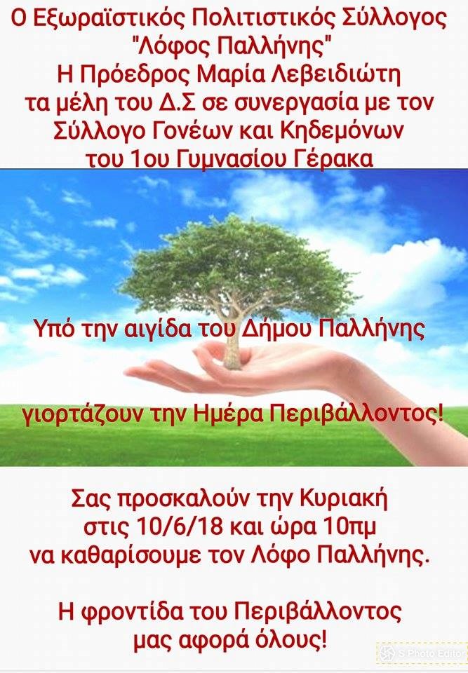 Ο Εξωραϊστικός & Πολιτιστικός Σύλλογος “Λόφος Παλλήνης”, η Πρόεδρος Μαρία Λεβειδιώτη, τα μέλη του Δ.Σ. σε συνεργασία με τον Σύλλογο Γονέων και Κηδεμόνων του 1ου Γυμνασίου Γέρακα, υπό την αιγίδα του Δήμου Παλλήνης, γιορτάζουν την Ημέρα Περιβάλλοντος!