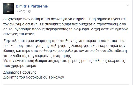 Μετά τον σάλο που προκάλεσε η προηγούμενη ανάρτηση στο Facebook του Διοικητή του Νοσοκομείου Τρικάλων, Δημήτρη Παρθένη, ως προς τις εκφράσεις που χρησιμοποίησε, ήρθε και η παραδοχή του περί λάθους.