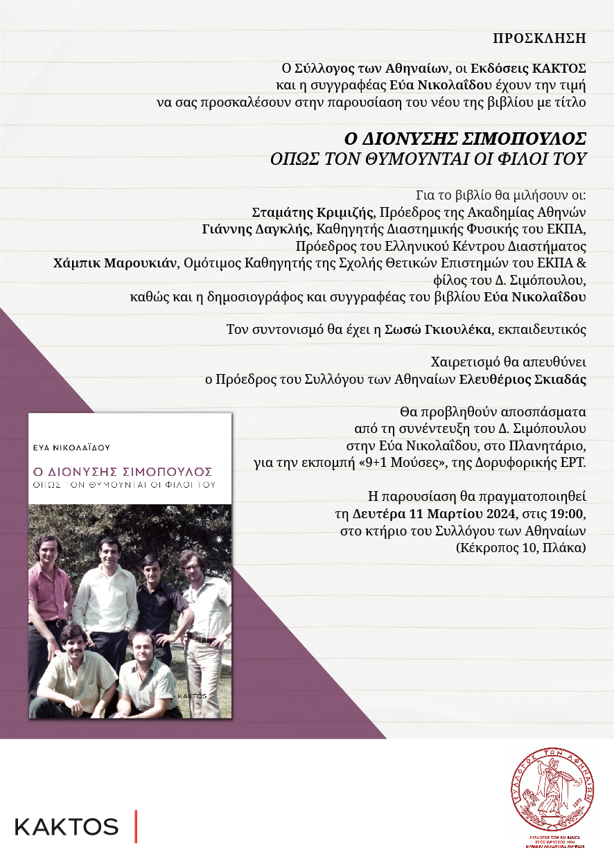 Το νέο βιβλίο της Εύας Νικολαΐδου, με τίτλο «Ο Διονύσης Σιμόπουλος όπως τον θυμούνται οι φίλοι του» θα παρουσιαστεί την Δευτέρα, 11 Μαρτίου 2024, στις 19.00, στην αίθουσα του Συλλόγου των Αθηναίων, Κέκροπος 10, στην Πλάκα.