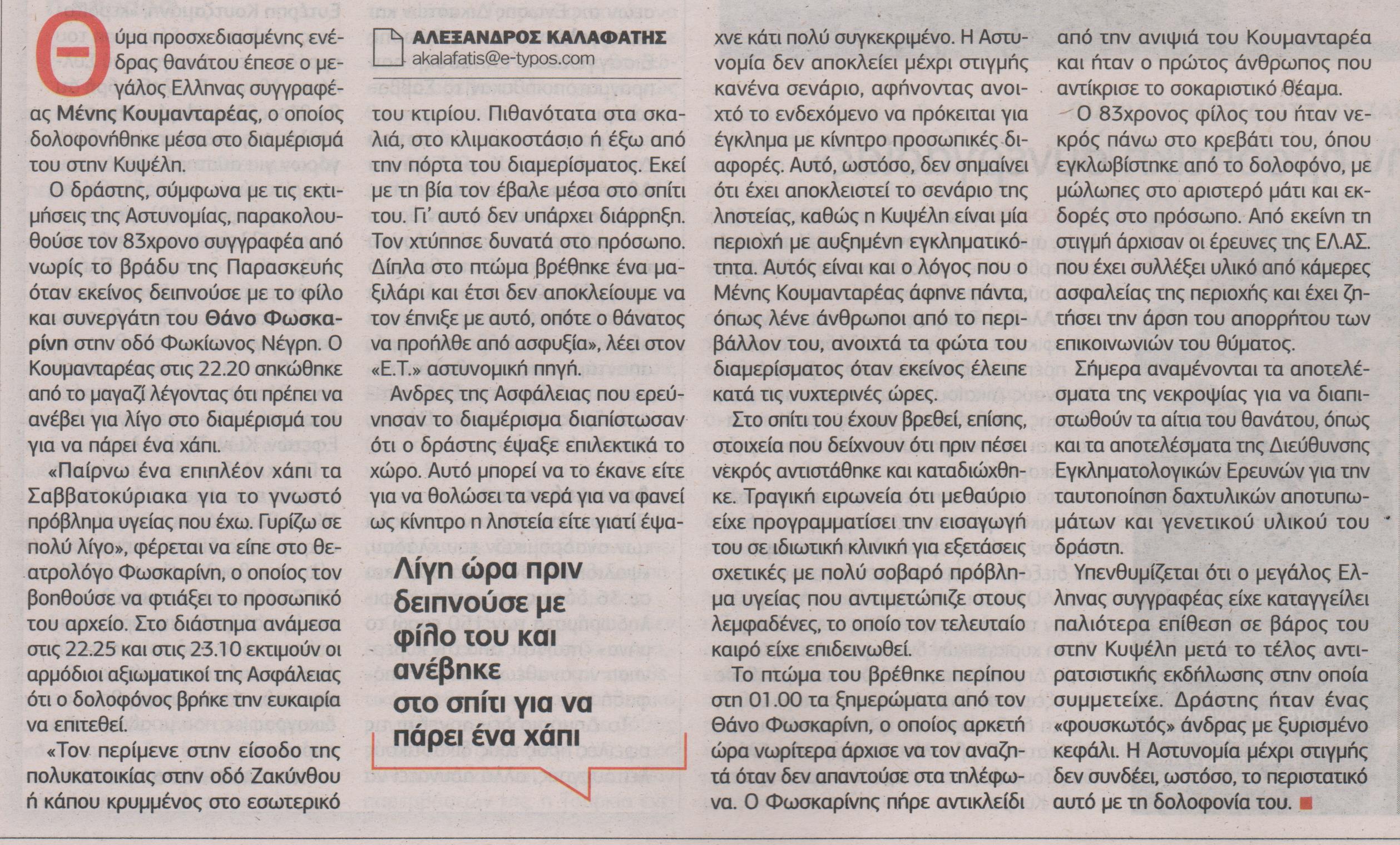 Θύμα προσχεδιασμένης ενέδρας θανάτου έπεσε ο μεγάλος Έλληνας συγγραφέας, Μένης Κουμανταρέας, ο οποίος δολοφονήθηκε μέσα στο διαμέρισμά του στην Κυψέλη.