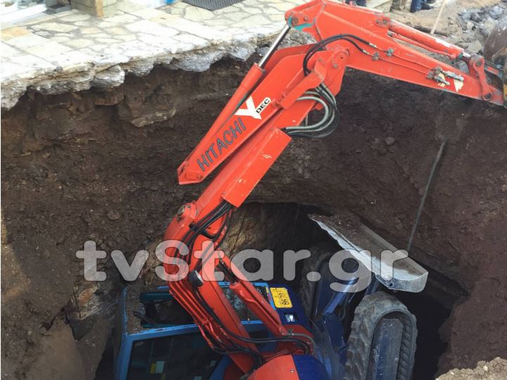 Ο δρόμος υποχώρησε ξαφνικά, ανοίγοντας μια τεράστια τρύπα με βάθος περίπου 5 μέτρα, με το μηχάνημα και τον χειριστή του να “εξαφανίζονται”.